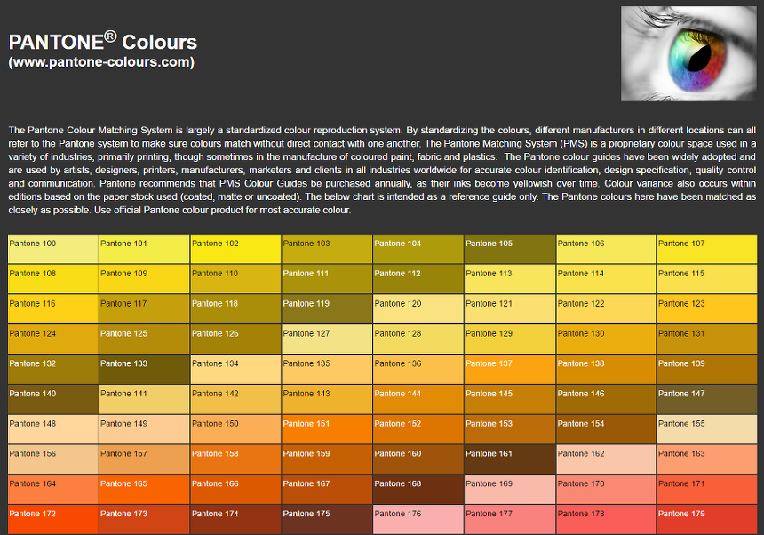 - 팬톤 표준 색상들을 한 눈에 알아 보기 쉽게 나열하여 보여주는 웹사이트입니다. 여기서 말하는 팬톤 표준 색상들이란 PMS(Pantone Color Matching System)에 기반하여 표현된 색상들로 어떤 플랫폼에서든 안정되며 일관된 색상을 보여주기 위해 고안된 사항입니다.