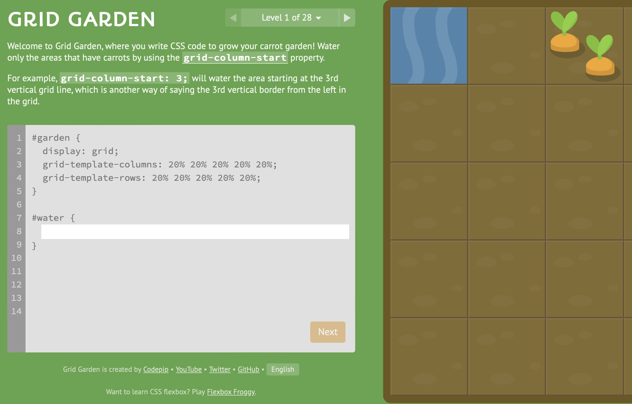 Grid Garden은 Flexbox Froggy의 제작자가 만든 또 다른 게임으로, CSS Grid에 중점을 둡니다. grid-template-columns, grid-template-rows, grid-area 등 CSS Grid 코드를 작성하여 당근 밭에 물을 주며 학습할 수 있습니다.