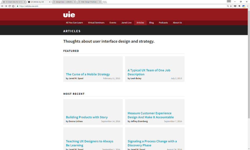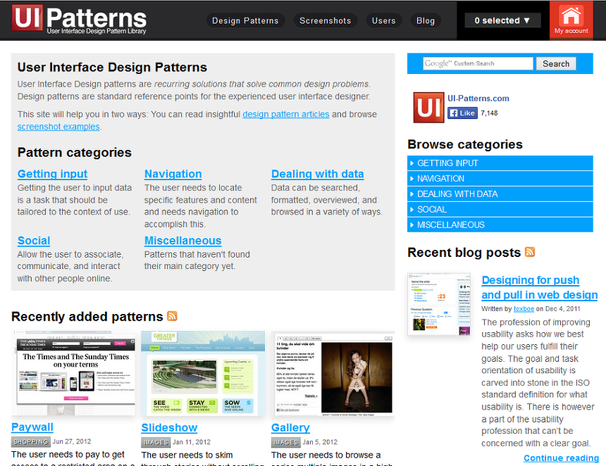 UI 패턴스라는 이 사이트는, 말 그대로 UI디자인 패턴을 쉽게 찾을 수 있게 해주며, 더불어서 디자인 패턴들을 그룹화하는 기능까지 제공합니다. 또한 UI디자인에 대한 기사를 작성하기도 하니, UI디자인에 대한 이해도를 높이는 데에도 활용할 수 있는 사이트라고 볼 수 있습니다.