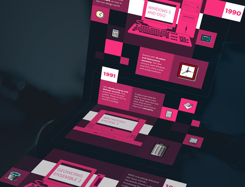 컴퓨터 아이콘의 역사는 매우 유의미합니다. 컴퓨터 아이콘은 먼 어디에선가 만들어졌다고 볼 수도 있으며 혹은 우리 생활 근처에서 발생했다고 볼 수도 있습니다. 뉴스에서 다뤄지지도 않았으며, 저녁 식사의 주제로 여겨지지도 않습니다. 이것은 그저 컴퓨터 시스템의 발전과 함께 조금씩 진화해 왔으며, 우리 일상 생활에 점차 매우 큰 영향을 미쳐 나가고 있습니다. 컴퓨터 아이콘은 단어와 이미지를 매우 직관적이면서 상징적인 체계를 통해서 전달하는 시각언어입니다. 이 아이콘들의 등장에는 어떤 크리에이터들이 있었다는 사실을 알고 계신가요? 혹은 1985년에는 아이콘을 위해 몇 개의 색상만이 허용되었는지 또는 애플의 과거 로고는 어땠는지 알고 계신지요. 이와 같은 흥미로운 사실들을 정보 그래픽으로 담아내는 작업을 Futuramo에서 진행해 보았습니다.