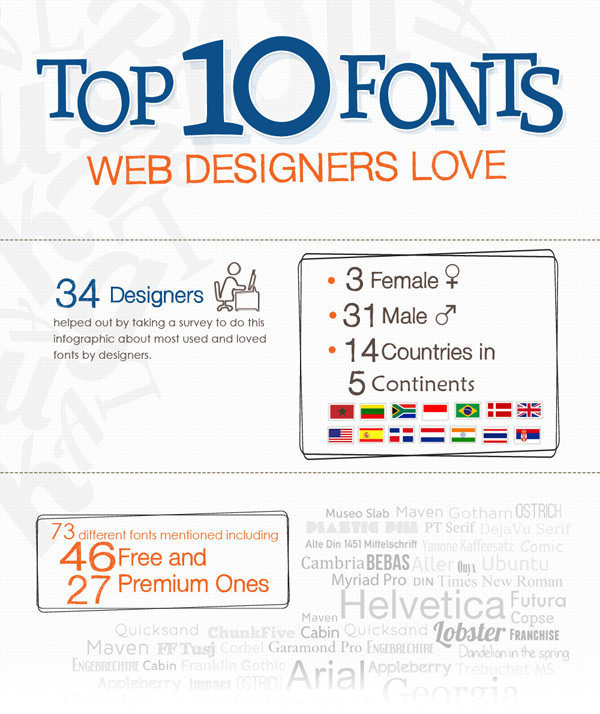 Polldaddy,Forrsr, Facebook, Twitter와 같은 서비스를 통해서 조사를 진행했으며, 총 14개국에 있는 34명의 디자이너들로부터 어떤 폰트를 선호하는지 조사에 대한 응답을 받을 수 있었습니다. 조사 결과는 흥미로웠으며 해당 결과는 인포그래픽으로 시각화하여 Piktochart에 게재해 놓았으며 바로 밑에도 해당 내용을 포함해 놓았습니다.