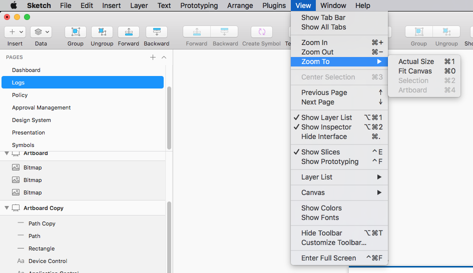 다음으로 스케치를 실행해서, 단축키를 맵핑하고 싶은 커맨드 이름을 확인합니다. 저는 지금 Fit to 100% 단축키인 Actual Size라는 커맨드의 단축키를 변경하고자 합니다.