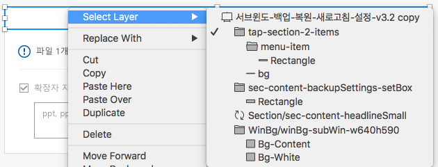 개체에 커서를 두고 우클릭(또는 ctrl + 클릭)을 하면 해당 커서에 대응하는 레이어들을 일괄적으로 확인할 수 있다. 직관성이나 속도 측면에서 마우스로 직접 선택하는 것보다 비효율적인 방법이지만, 실수를 최소화할 수 있는 방법이기도 하다.