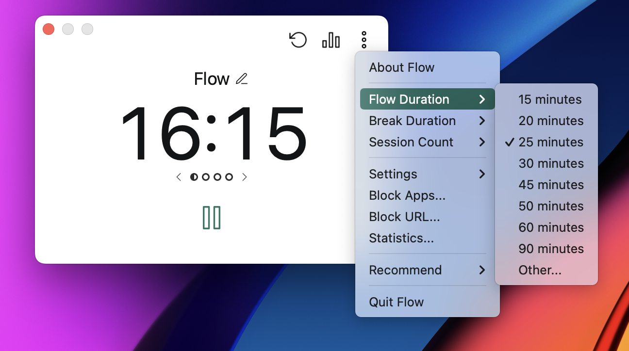 포모도로 타이머는 전세계 많은 사람들이 시간의 효율적 활용을 위해 이용하고 있는 방법입니다. 포모도로는 간략하게 이야기하면 25분 동안 집중해서 업무를 수행하고, 5분의 휴식을 지니는 사이클을 반복하여 업무 생산성을 높이는 방식입니다. 전용 타이머를 책상 위에 배치해서 사용하거나, 별도로 시간을 측정하는 등 포모도로를 실행할 수 있는 방법은 다양합니다. 오늘 소개하고자 하는 어플리케이션은 포모도로, 그리고 꼭 포모도로가 아니더라도 시간관리를 쉽게 할 수 있도록 도와주는 서비스입니다. '플로우(Flow)'라는 이름으로 맥용 어플리케이션이며, 맥용 앱스토어에서 다운로드 받을 수 있습니다.