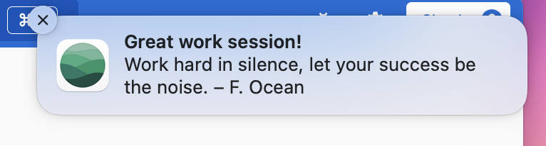 이 앱은 위트도 포함하여 서비스를 제공하는데, 설정에서 집중 모드가 끝날 때 마다 동기부여 관련 명언들을 알림으로 출력해 주는 기능이 있습니다. 이 기능을 통해서 집중 모드가 끝날 때 잠깐이나마 긴장을 풀고, 스스로의 동기부여 에너지를 재충전하는 촉매제로 활용할 수 있을 것입니다.