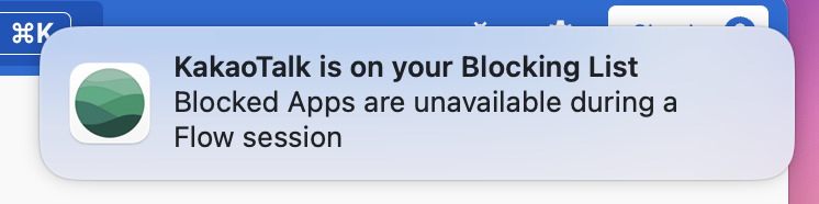 또 하나의 특징은 'Forest' 앱처럼 특정 어플리케이션과 웹사이트를 차단하는 기능을 제공한다는 점입니다. 웹사이트 차단 기능은 유료 기능을 구매해야만 활성화되는 기능이며, 유료 기능은 금액은 프로 버전이라는 이름으로 제공되며 5,000원 미만의 금액으로 이용이 가능합니다. 카카오톡이나 다른 메신저 서비스처럼 개인의 업무 집중도 형성에 방해가 될 수 있는 어플리케이션들은 차단 리스트에 포함하면 집중시간이 활성화된 시간 동안 실행이 불가합니다(Flow 서비스가 알림을 주는 방식으로 앱 사용을 저지).