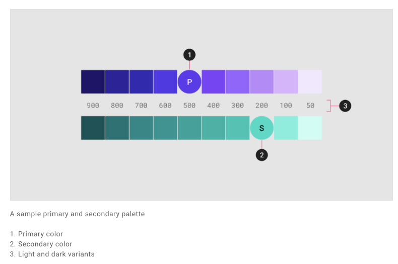밝기를 통해 컬러 스텝을 정의하는 과정의 경우 틴트 또는 쉐이드를 통해 분류하는 두 가지 과정으로 분류해서 파악할 수 있습니다. 쉐이드는 단순히 한 색상의 투명도를 조절한다고 보면 됩니다. 틴트는 밝기와 채도를 변경하여 컬러 스텝을 정의하는 과정으로 보다 일반적인 명도의 차이에 따른 색상의 정의 과정이라고 볼 수 있습니다. 이러한 컬러 스텝의 정의 과정을 디자이너가 일종의 원칙에 따라 직관적으로 진행할 수도 있고, 일종의 수식이나 보다 복잡한 원칙을 통해서 구체화할 수도 있습니다. 틴트와 쉐이드(명청색, 암청색)의 색상 이론 차원에서의 보다 자세한 차이는 다음 아티클을 통해 확인해 보시기 바랍니다.