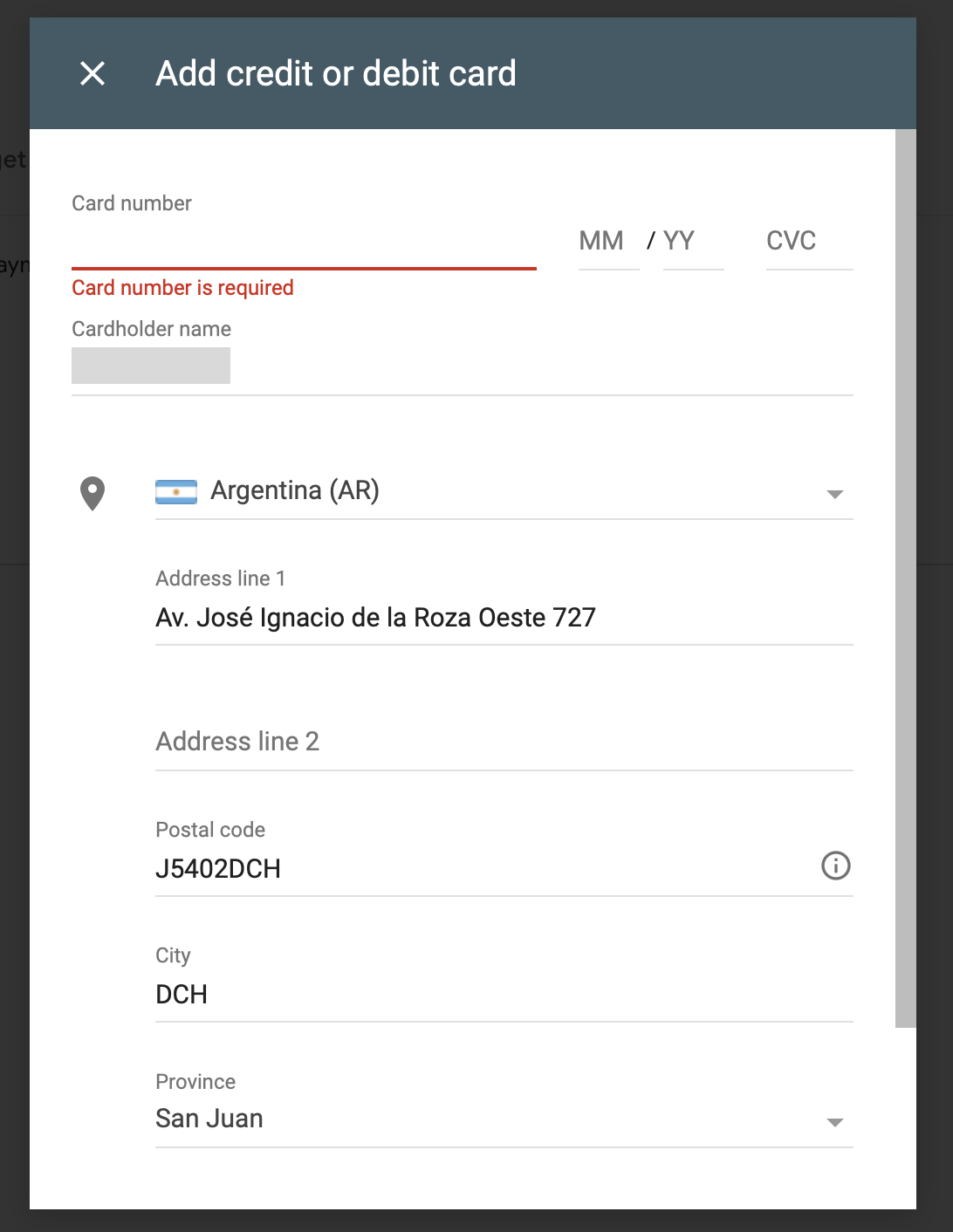 해외결제용 신용카드 정보와 아르헨티나 주소를 기입해 결제 진행