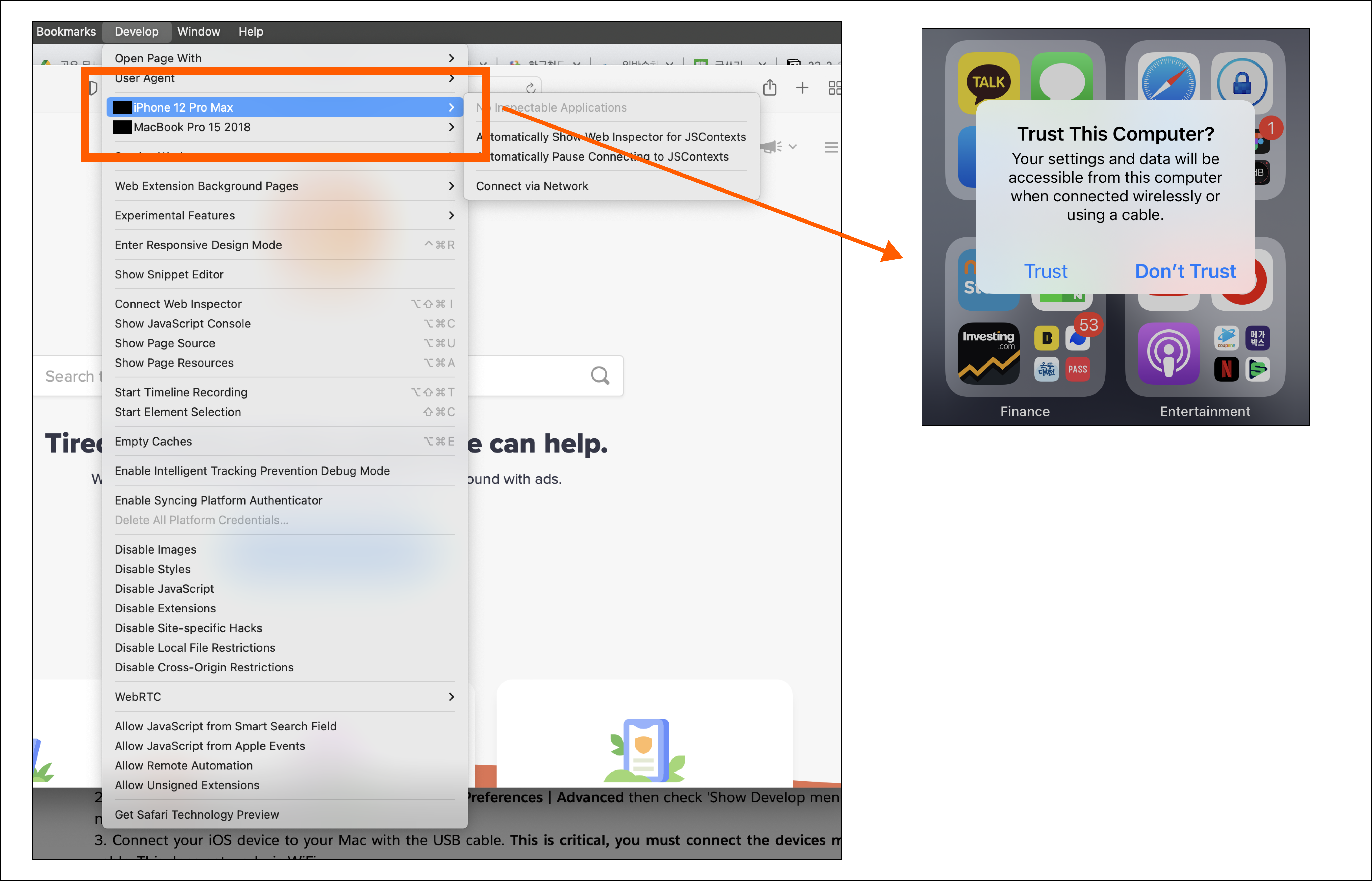 맥과 아이폰 또는 iOS 기기를 케이블을 통해 직접 연결합니다. 정품 케이블이 아니거나 허브 등을 통해 연결하는 경우 정상적으로 연결이 안 될 수 있습니다. 위의 과정을 잘 마쳤고, 케이블을 통한 연결이 잘 이루어졌으면 맥의 사파리에 있는 개발(Develop) 메뉴를 통해서 연결된 기기를 확인할 수 있어야 합니다. 아이폰이 탐색되어 이를 선택하면, 아이폰 상에서 신뢰할 수 있는 기기인지를 질의하는 팝업이 생성됩니다. 이에 승락을 하면 개발자 도구를 통한 모바일웹 디버깅 환경 구축이 성공적으로 이루어진 것으로 볼 수 있습니다.