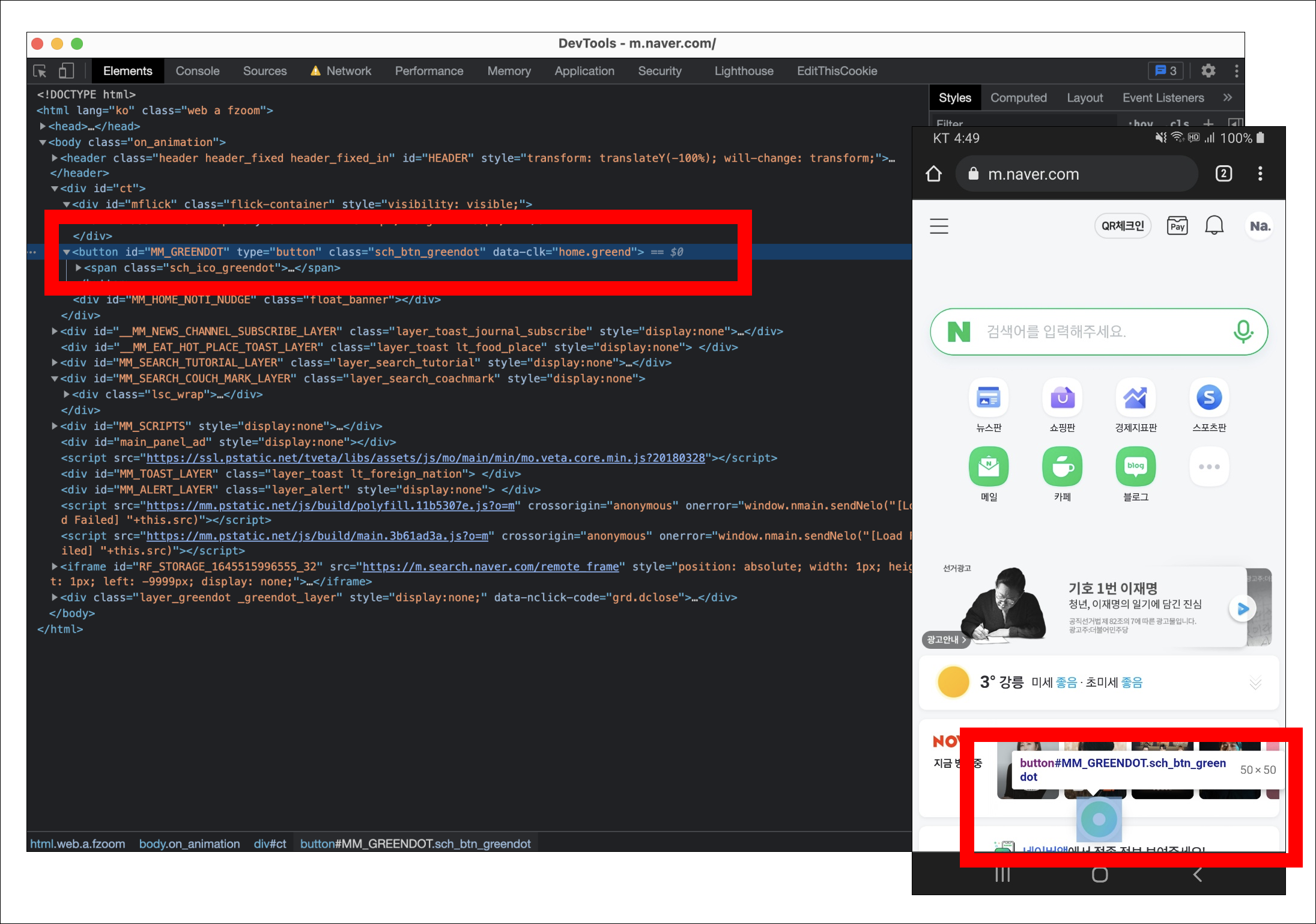 확인하고자 하는 URL을 열은 이후 inspect 버튼을 누르면 컴퓨터용 크롬에서 개발자 도구가 활성화되며 안드로이드 기기의 크롬에서 inspect할 엘리먼트들을 확인할 수 있습니다. 컴퓨터용 크롬에서 작동하는 개발자 도구의 기능들을 활용하여 안드로이드 기기 상에서의 정상작동 여부를 확인할 수 있습니다.
