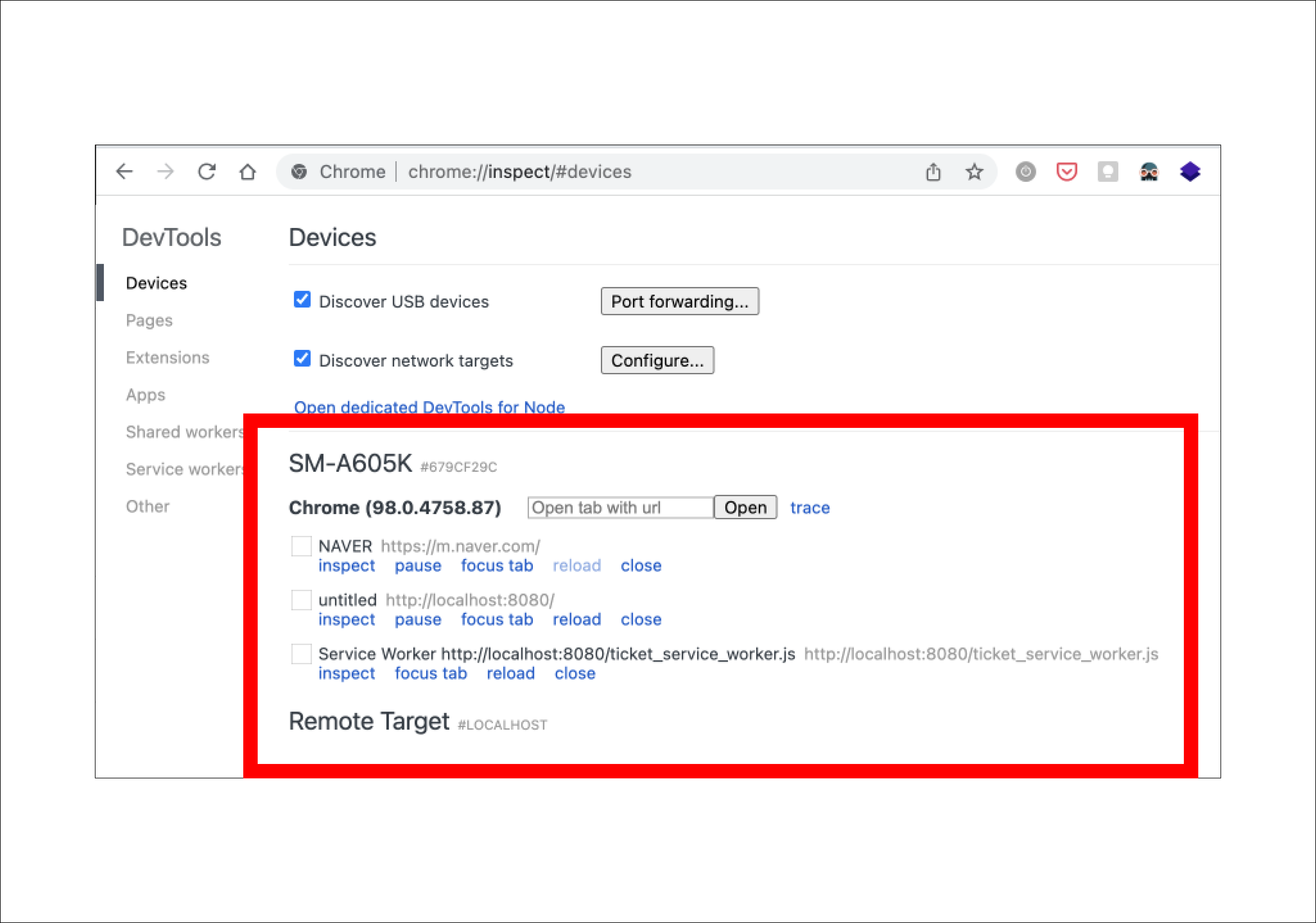 3. 크롬 실행 후 chrome://inspect 옵션에서 개발자 도구