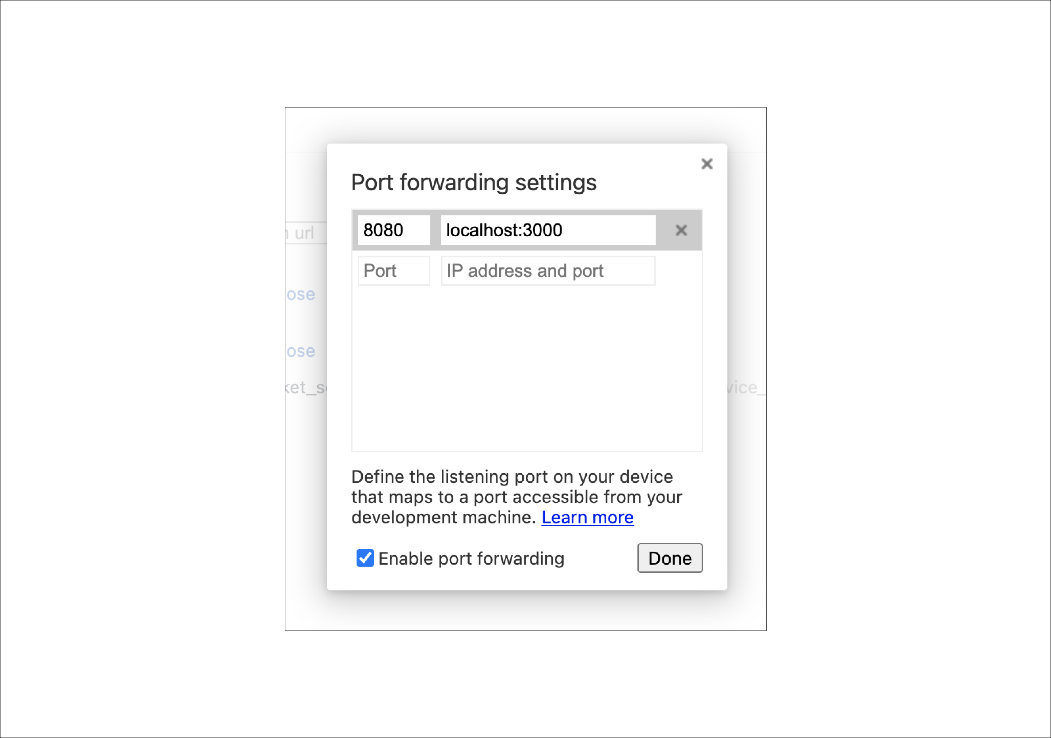 로컬호스트로 개발환경이 구축된 경우 해당 포트를 포트포워딩함으로써 안드로이드 기기에서 해당 개발환경을 열 수 있습니다. 하기 첨부된 이미지를 예시로 들면, 3000번 포트의 개발환경을 8080으로 포트포워딩함으로써, 안드로이드 기기에서 localhost:8080을 접속하면 개발용 컴퓨터에서 작업하던 로컬호스트 환경에 접속이 가능합니다.