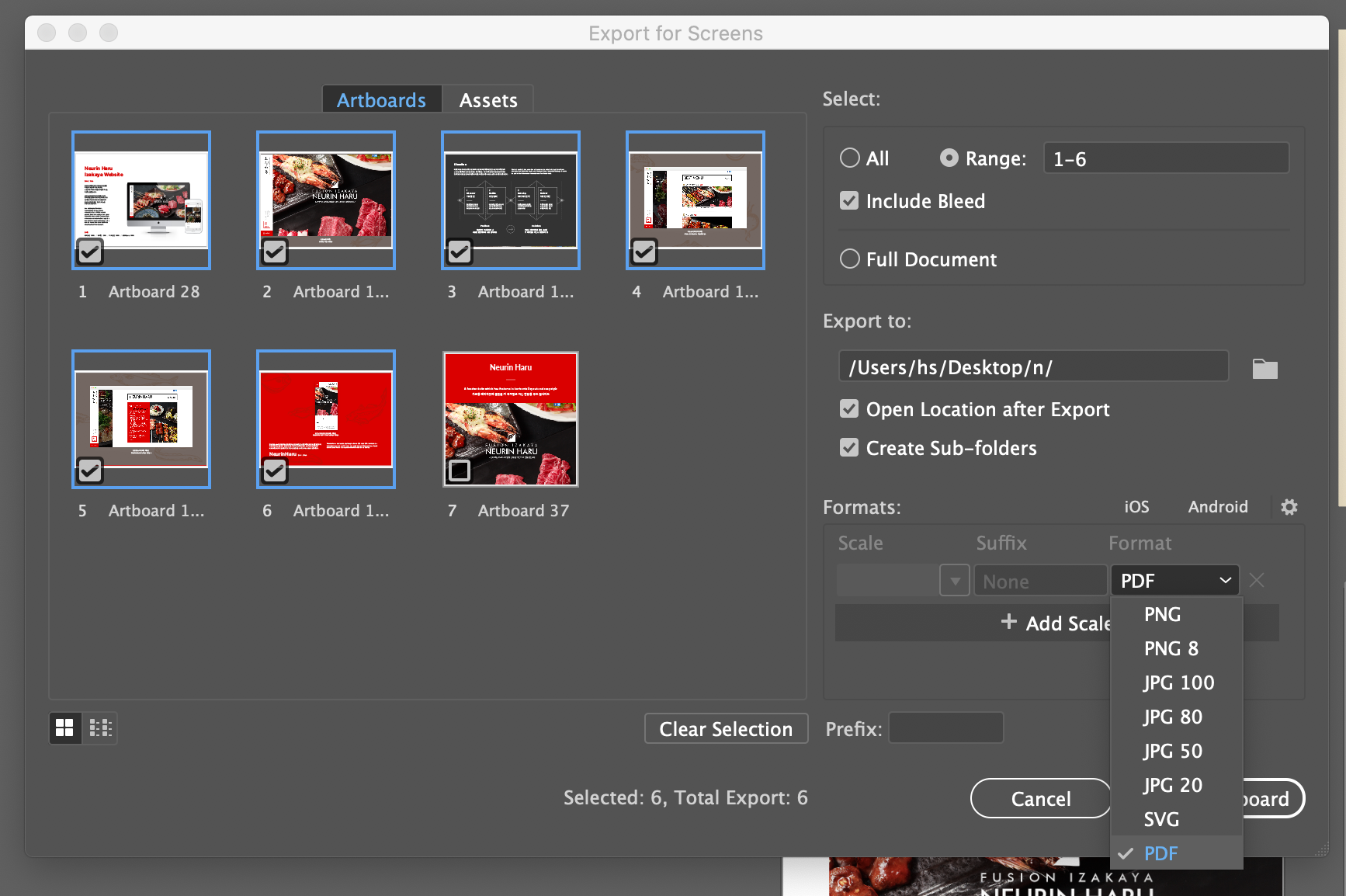 일러스트레이터를 통해 PDF산출물을 만드는 경우는 매우 많습니다. Save as를 통해서 AI 파일 자체를 PDF로 저장하는 것도 방법이고, 실제로 '인쇄' 작업 등에 있어서는 이 방법이 더 효율적일 수 있습니다. 다만 일부 아트보드들만 선택해서 저장하고 싶은 경우, 그리고 별도의 파일 생성 없이 PDF 익스포팅을 원하는 경우에는 'File > Export > Export for Screens' 메뉴에서 파일 포맷을 PDF로 선택한 후 익스포팅을 진행하면 됩니다. 화면에서 볼 수 있듯이 전체 아트보드 또는 일부 아트보드만 선택하여 익스포팅을 선택할 수 있습니다. 다만 기본 셋팅값이 저화질로 설정이 되어 있기 때문에 관련 버튼 옆에 있는 설정 버튼을 눌러서 품질을 고화질로 선택한 후 진행하면 고품질의 PDF 파일들을 얻을 수 있습니다.