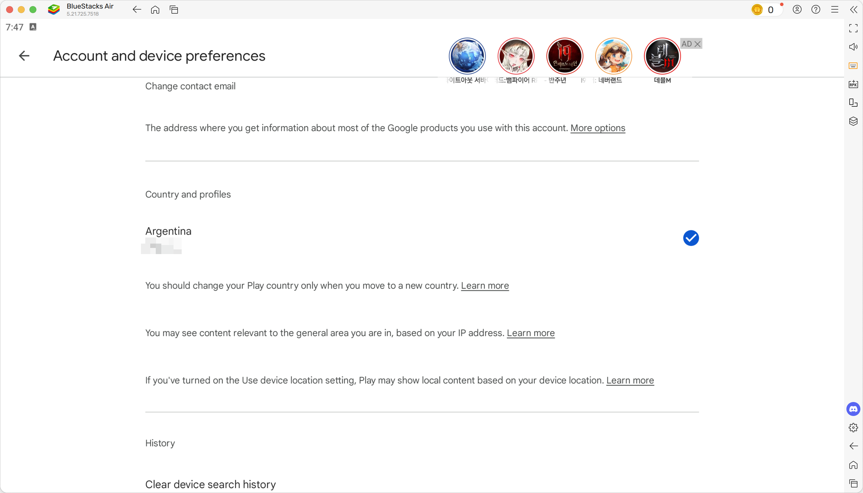 웹용 플레이 스토어에서는 국가 정보 변경이 활성화 되어 있지 않습니다. 모바일 버전의 플레이 스토어 실행이 필요하며 이 경우, 새로운 휻대폰을 사거나(...) 가상화 프로그램을 활용하여 새로운 안드로이드 기기를 생성하는 방법이 있습니다. 여기서는 'BlueStacks'라는 가상화 프로그램을 활용하여 신규 안드로이드 인스턴스를 생성하고 구글 계정으로 로그인하여 국가 계정을 변경하는 과정을 설명 드리겠습니다. 단 BlueStacks 실행 시 해당 국가의 VPN이 켜진 상태로 접속해야 국가 변경이 정상적으로 가능합니다.