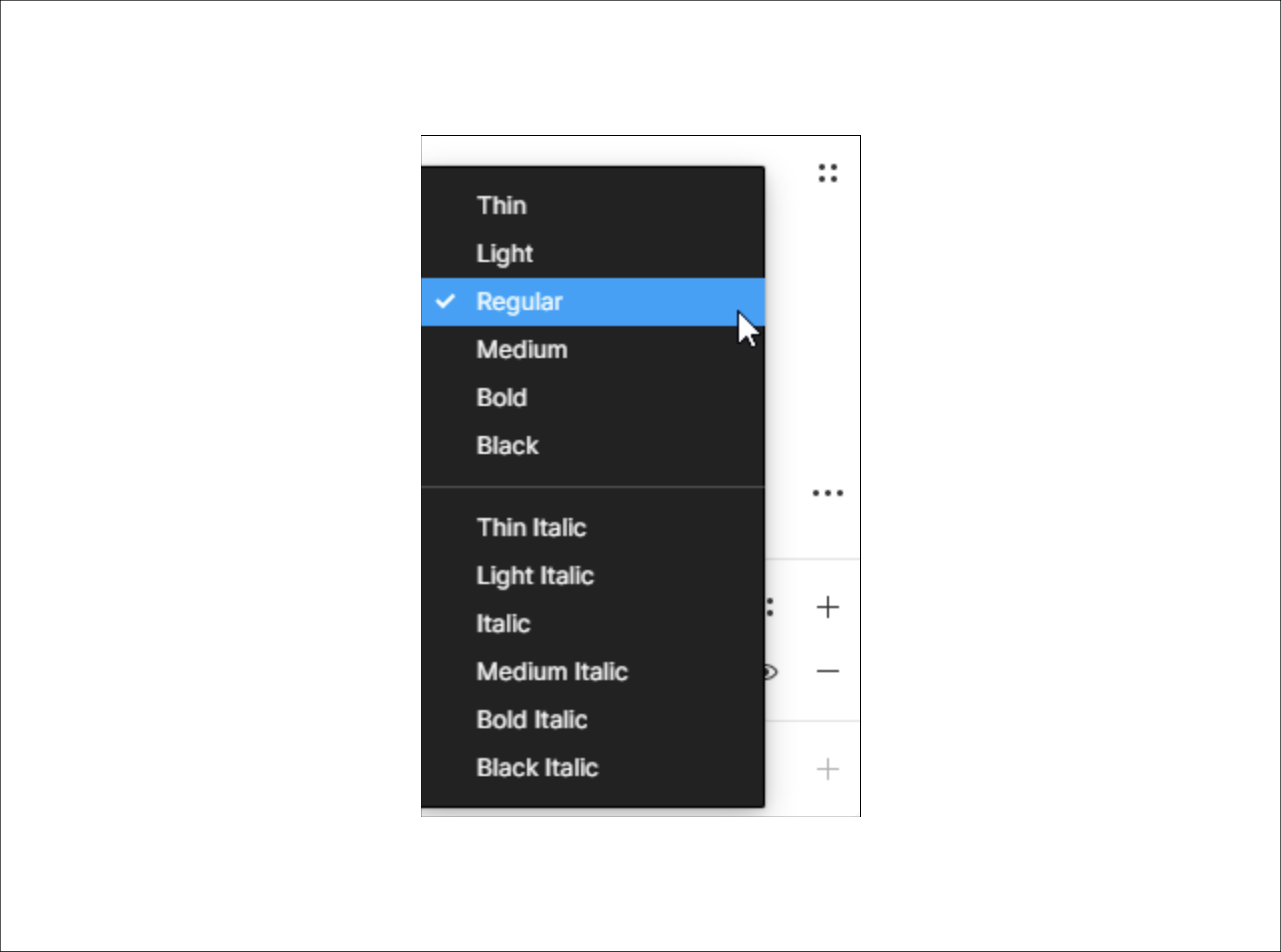 포토샵이나 CSS에서 강제적으로 폰트를 기울이는 faux 방식의 bold, italic체 설정은 피그마에서 할 수 없습니다. 폰트에 포함되어 있는 것이 아니라면 강제 이탤릭체를 주는 것은 폰트를 왜곡해서 사용하는 것과 다름이 없기 때문에, 이탤릭체를 제공하는 폰트에 대해서만 기울기를 주고서 사용하는 것이 권장됩니다.