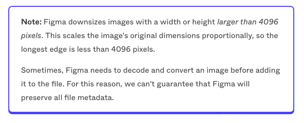 이러한 제약에서 벗어나기 위해서는 대형 이미지를 짤라서 넣거나, 이미지 품질을 좀 포기하더라도 해상도를 줄여서 삽입하는 방법이 있습니다. 이러한 제약사항을 잘 참고하시어 이미지를 활용한 작업에 있어서 불편이 없으시길 바랍니다. 더 자세한 내용은 피그마 공식 가이드의 이미지 관련 문서에서 확인할 수 있습니다.