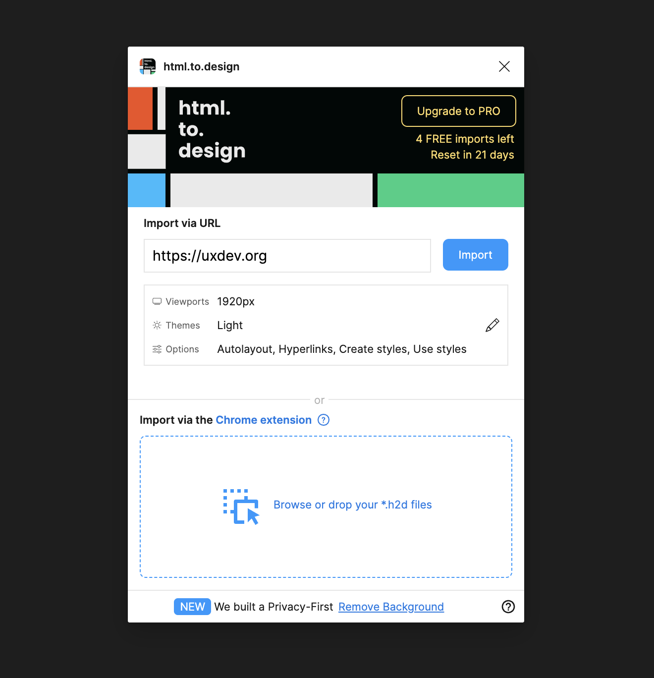 피그마 플러그인에서 바로 URL을 통한 임포트 방식이 있는 반면, 크롬 브라우저 익스텐션을 통한 임포트도 가능합니다. 이 경우 로그인이 필요한 웹페이지나 특정 조건을 충족해야 하는 페이지에 대해서 디자인을 임포트하는 것이 가능하게 해 줍니다. 크롬 브라우저 익스텐션은 크롬웹스토어에서 'html.to.design'을 검색하여 설치가 가능합니다. 설치 후 익스텐션은 실행하면 조건을 선택한 후 해당 디자인이 담긴 파일을 다운로드 할 수 있게 해 줍니다. 다운로드된 파일을 피그마를 실행한 후 'html.to.design' 플러그인에서 해당 파일을 로드할 수 있습니다. 그러면 URL 임포트 방식과 마찬가지로 해당 디자인이 포함된 피그마 프레임 레이어가 신규 생성된 것을 확인할 수 있을 것입니다.