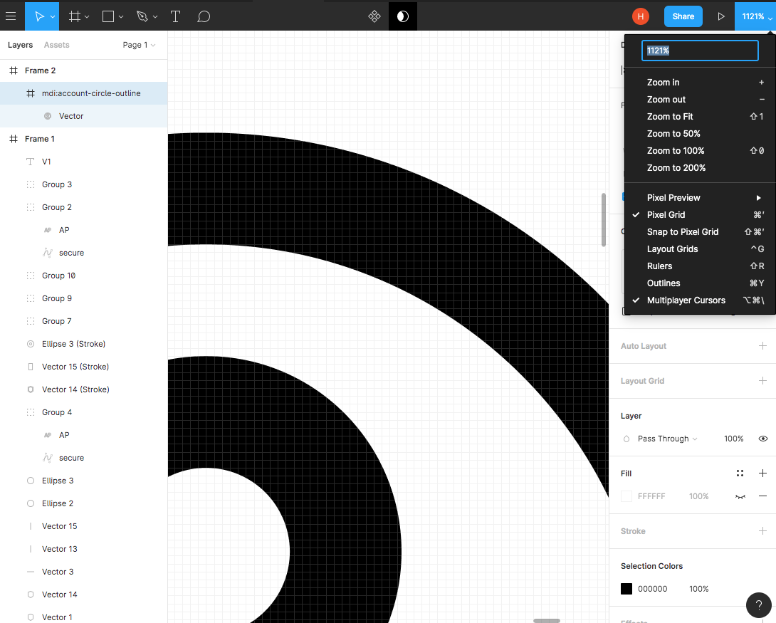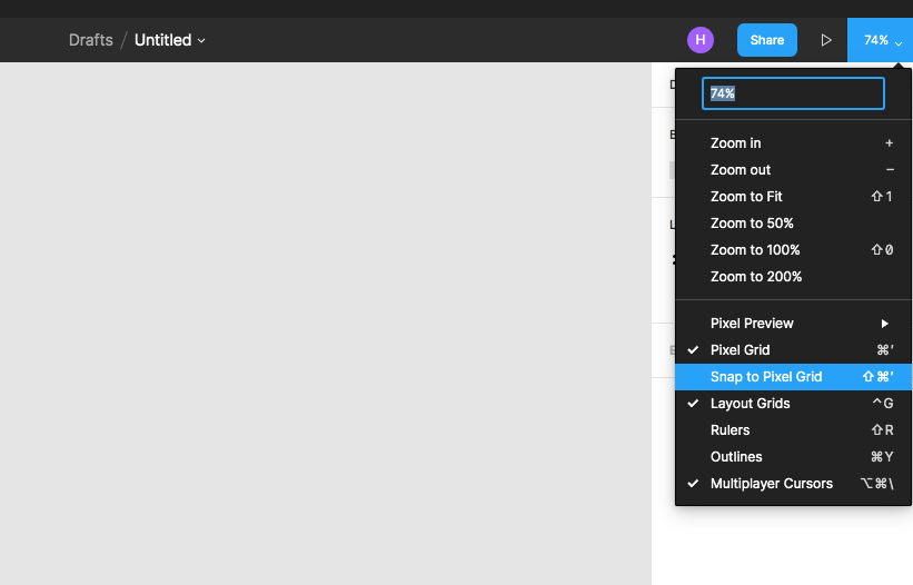 픽셀 그리드, 픽셀 스냅, 서브 픽셀 등의 개념과 관련된 항목들은 피그마의 '뷰' 메뉴에서 확인할 수 있습니다. 메인 인터페이스의 우측 상단에 있는 뷰의 퍼센테이지를 나타내는 드롭다운 버튼이 '뷰' 메뉴의 주요 메뉴들을 모아 놓은 버튼이기도 합니다.