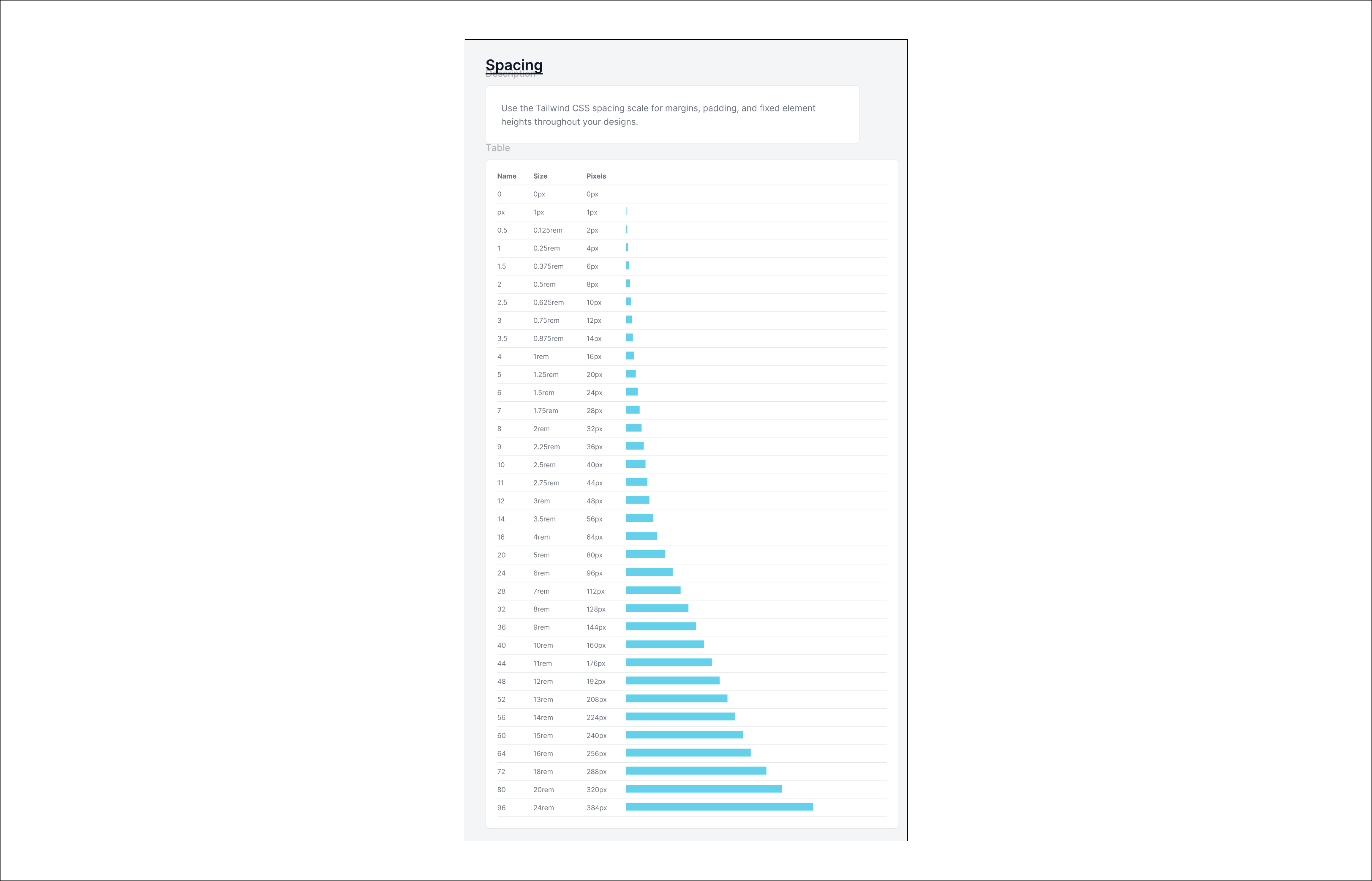 UI 디자인은 여러 컴포넌트의 배치로 이뤄지며 이 컴포넌트 간의 간격을 조절하는 것 또한 일관적으로 고민되어야 할 사항 중 하나입니다. 테일윈드의 가장 큰 장점 중 하나는 이런 스페이싱에 대한 스타일 정의가 매우 잘 되어 있고, 유틸리티 클래스를 활용해서 여백 주는 작업이 극단적으로 효율화될 수 있다는 점입니다. 가장 흔히 쓰이는 8pt 스페이싱 원칙을 기반으로 작은 단위에서는 0.5pt에서 2pt와 4pt 단위로도 구성이 가능합니다. 필요한 경우 별도 단위의 추가도 가능합니다. 아쉽게도 현재 2024년 7월 버전에서는 스페이싱은 로컬 베리어블로 등록이 안 되어 있습니다. 별도 베리어블 추가를 통해 전역 적용이 가능할 것으로 보입니다.