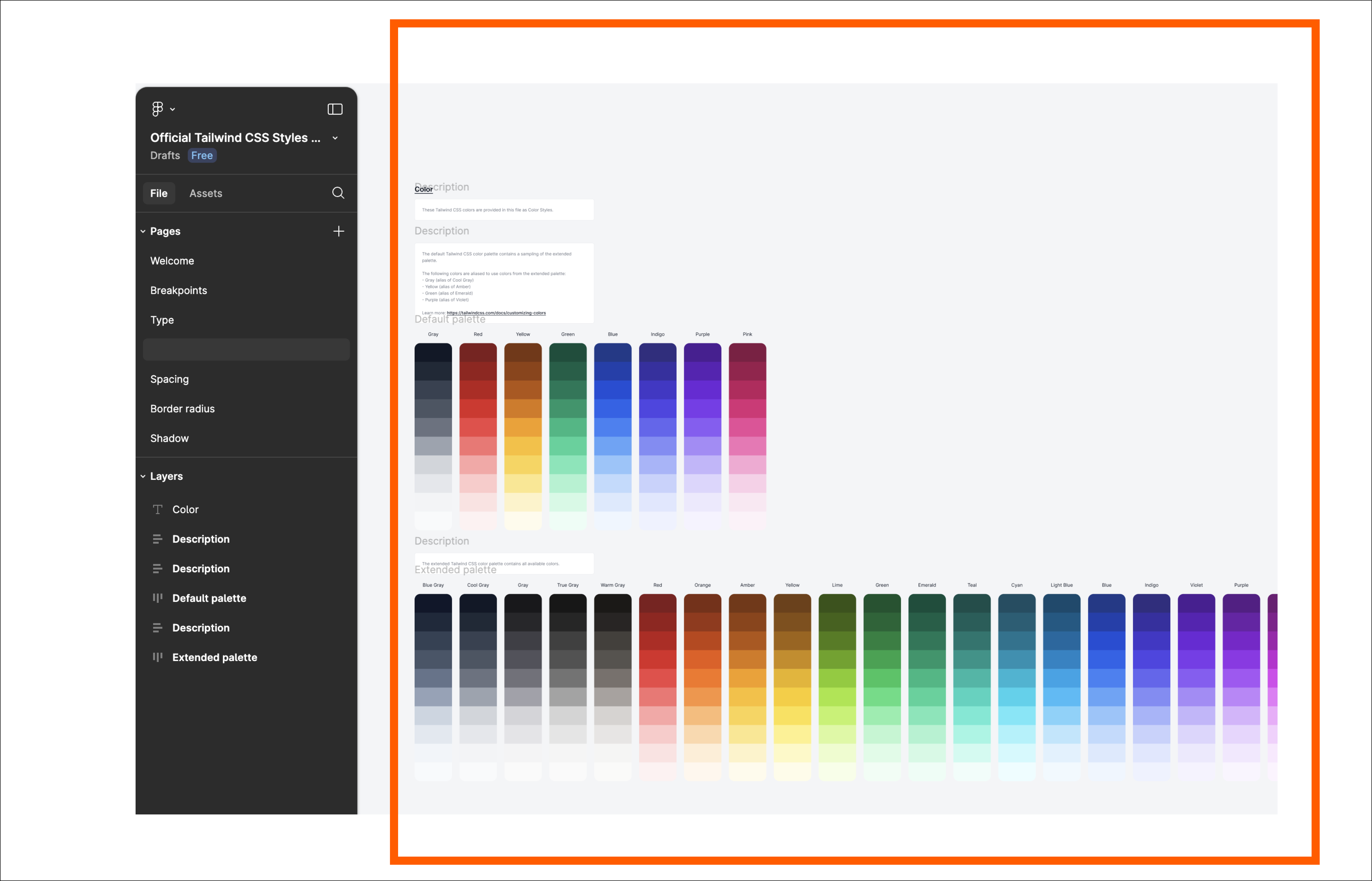 테일윈드 공식 피그마 템플릿이 존재하는데, 이 또한 기본적인 레이아웃과 색상, 스타일에 대한 내용만 제공할 뿐 보다 구체화된 버튼과 같은 컴포넌트에 대한 정의는 사용자가 직접 내려야 합니다. 그럼에도 테일윈드가 제공하는 디자인과 개발상의 규격과 토큰을 그대로 활용할 수 있게 때문에, 손쉽게 디자인 체계를 구성하고 또 개발로 바로 활용될 수 있는 형태로 구성이 가능합니다.