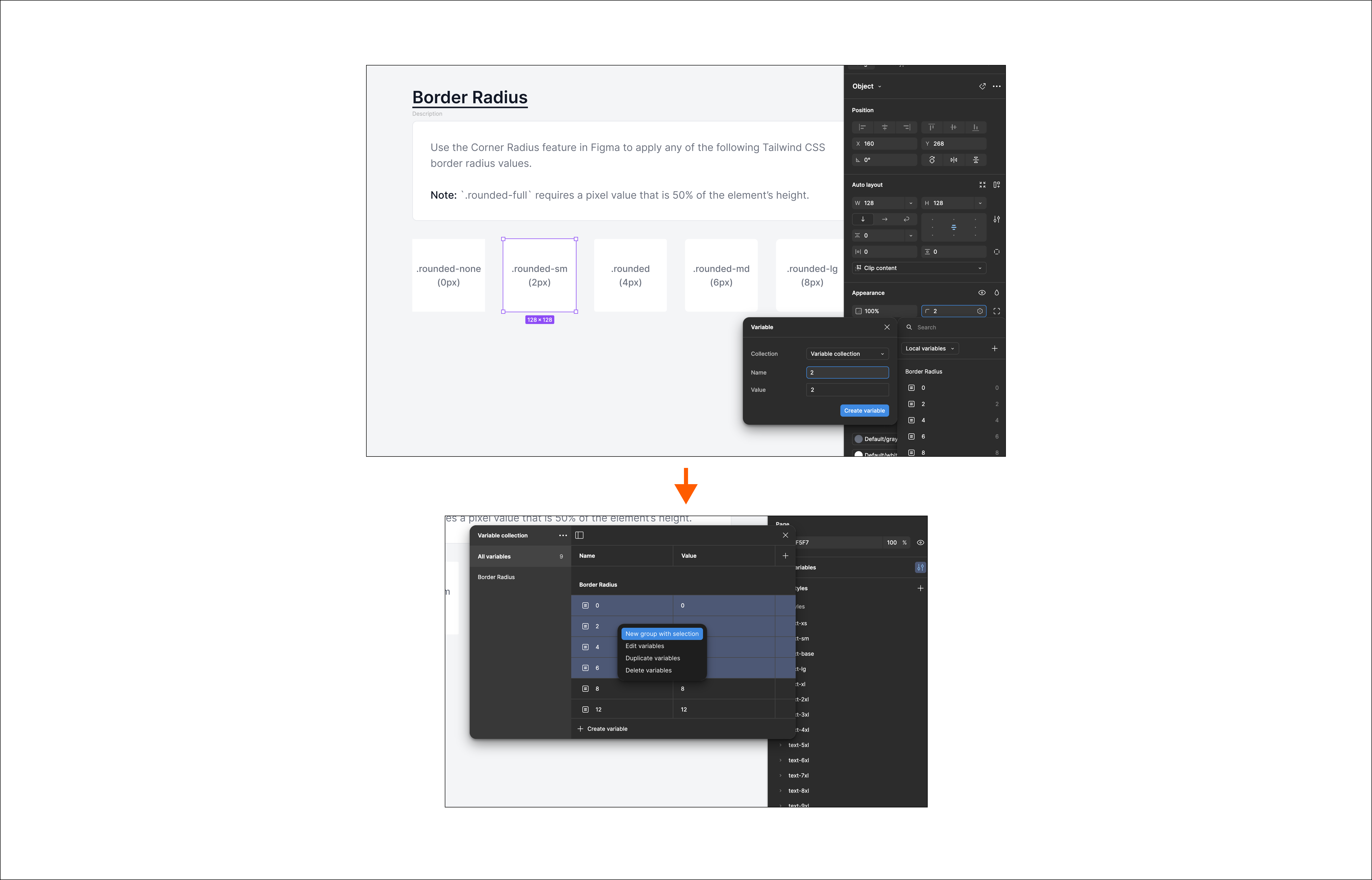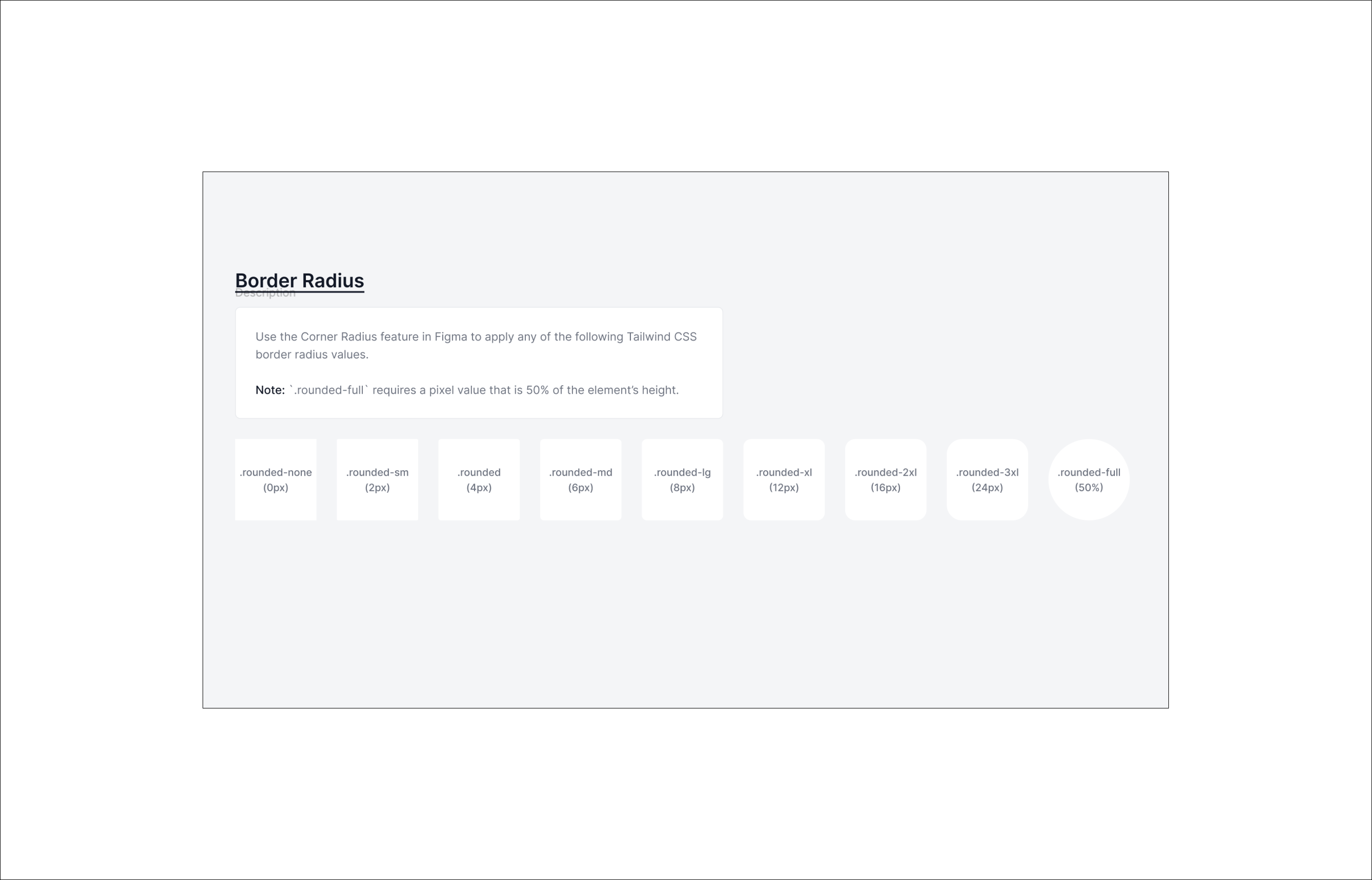 모서리 둥글기 또한 기존 제공되는 스타일을 활용할 수 있으며, 필요한 경우 스타일을 변경하여 토큰 값에 맞춰 규격화된 스타일 지정이 가능합니다. 다만 스페이싱과 마찬가지로 로컬 베리어블로 지정이 되어 있지 않아, 로컬 베리어블로 지정하여 값을 손쉽게 할당하고 싶은 경우 별도 변수 선언이 필요합니다.