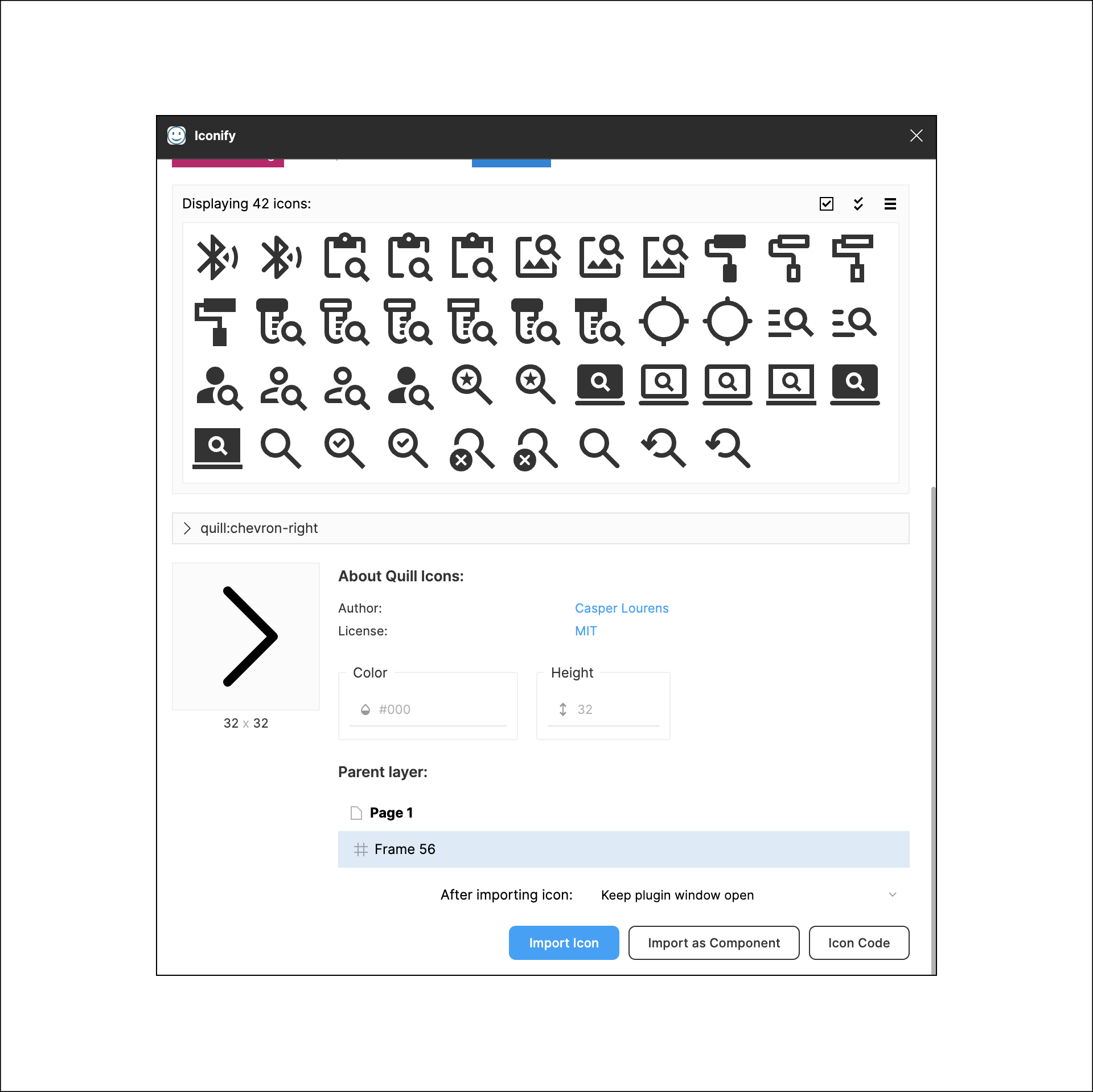 실행 후에는 아이콘 세트 목록과 함께 키워드를 검색할 수 있는 두 개의 텍스트 필드를 확인할 수 있습니다. 상단의 필드는 전체 검색에 쓰이며, 하단의 필드는 아이콘 세트를 검색할 때 쓰입니다. 아이콘 세트를 선택하여 해당 세트 내에서만 키워드로 검색할 수도 있으며, 이러한 방법을 통해 전체적인 선의 굵기나 스타일이 통일된 형태의 아이콘들을 디자인에 활용할 수 있습니다.