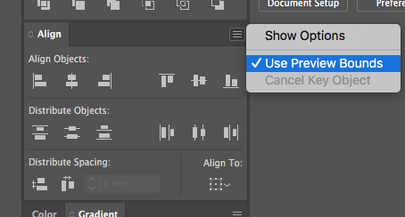 개체의 실제 크기를 측정하고 Bounding Box를 확장해 주는 역할을 하는 Preview Bounds를 끄고, 켜면 해당 버그가 일시적으로 해소된 것을 확인할 수 있다. Preview Bounds를 제어할 수 있는 방법은 여러가지가 있는데, 속성 창 및 정렬 옵션 패널 및 설정 창에서 제어가 가능하며 위 스크린샷을 참고해 주기 바란다. 이는 버그의 해결을 말하는 것이 아닌 일시적 해소이기에 언제든 해당 버그는 다시 발생할 수 있다. 다시 말하지만 이 버그의 특별한 발생 조건은 아직까지 확인하지 못하였다.