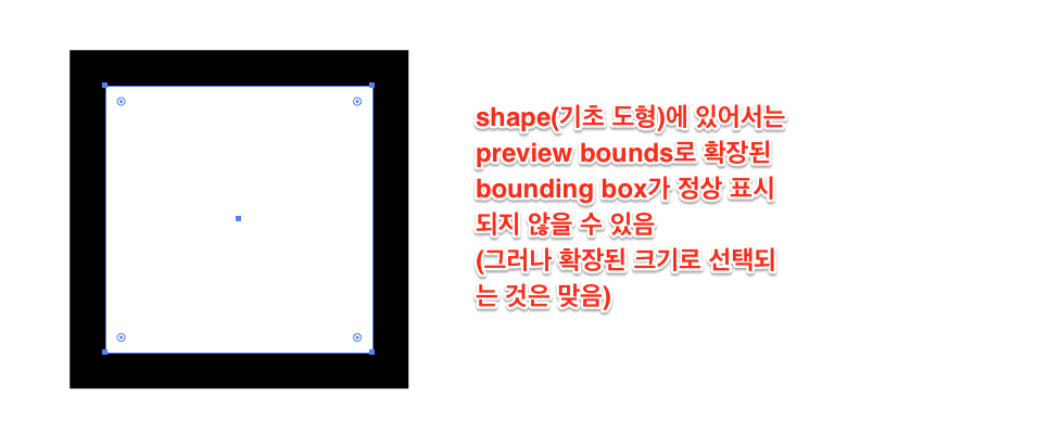 path를 다룰 때 outside border로 경계선을 주거나 한 상황에서 bounding box가 실제 시각적으로 표시되는 개체의 영역이 아닌 path의 개체만 포함하여 보여 주는 상황이 발생한다. 이같은 경우 일러스트레이터에서는 preference를 설정함으로써 전체 개체를 선택할 수 있다.