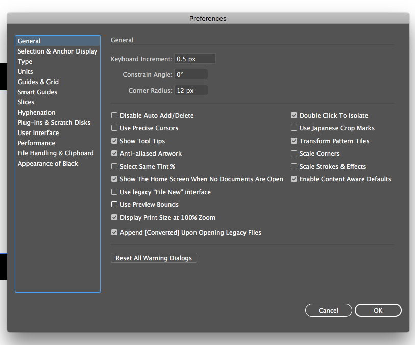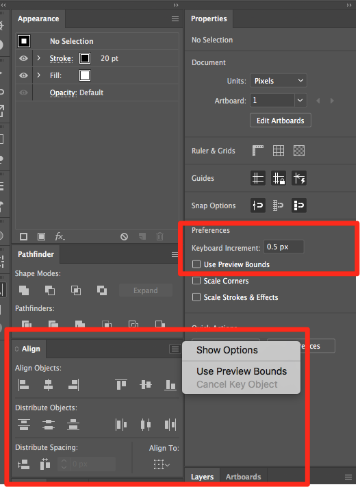 preview bounds(미리보기 경계선을 활성화)라는 옵션을 체크함으로써 전체 개체에 대한 bounding box 설정이 가능하다. preview bounds는 preference 외 다른 메뉴에서도 쉽게 접근하다.