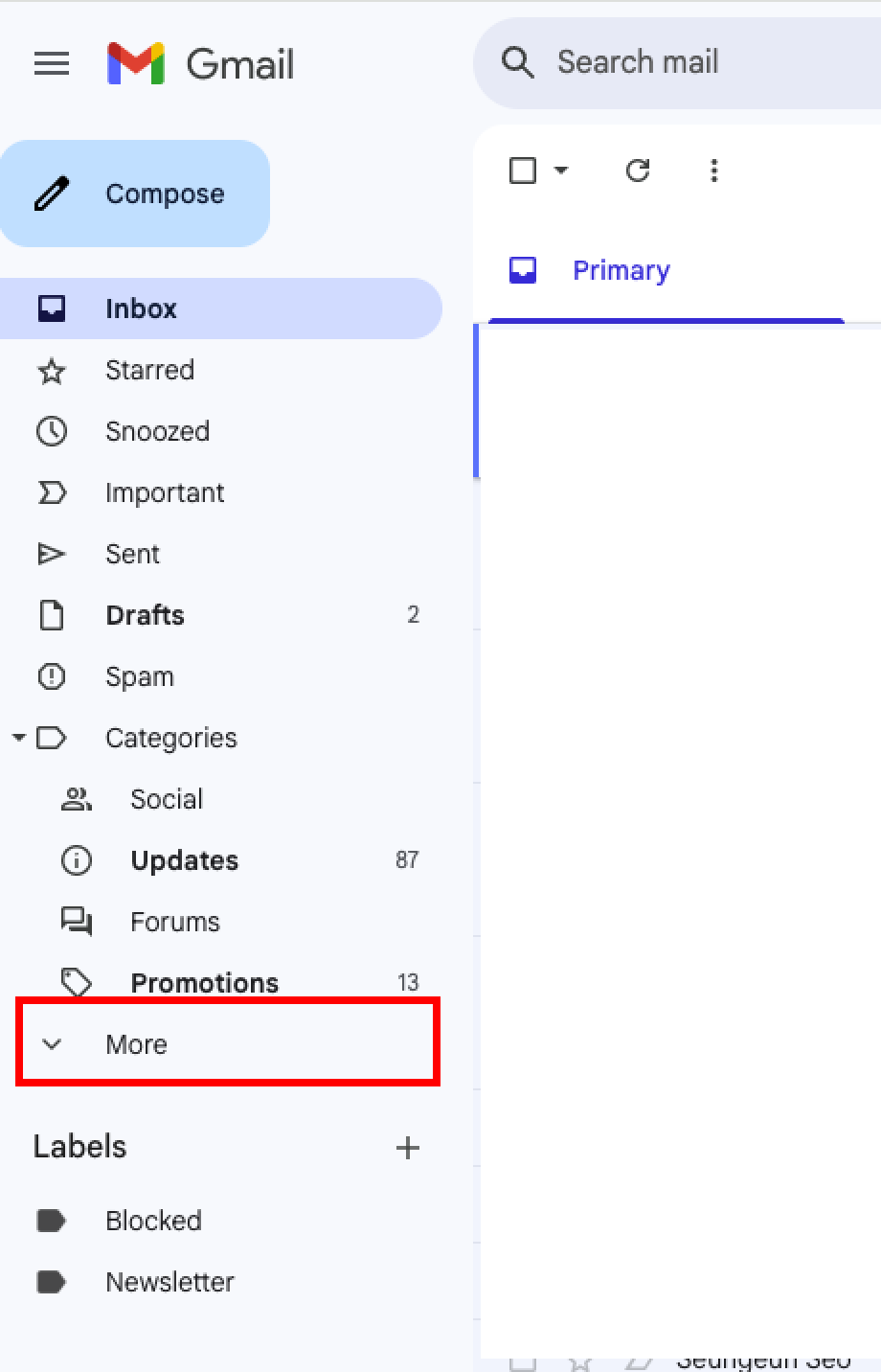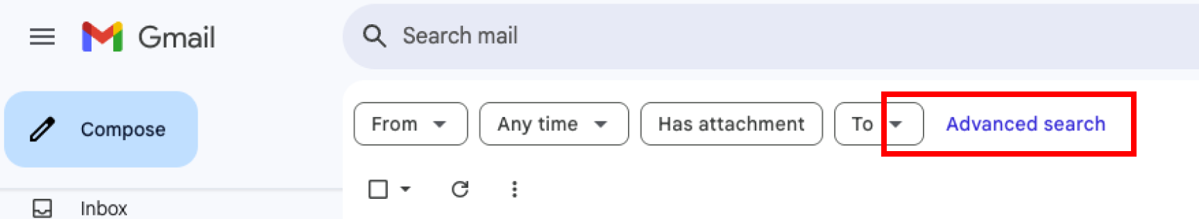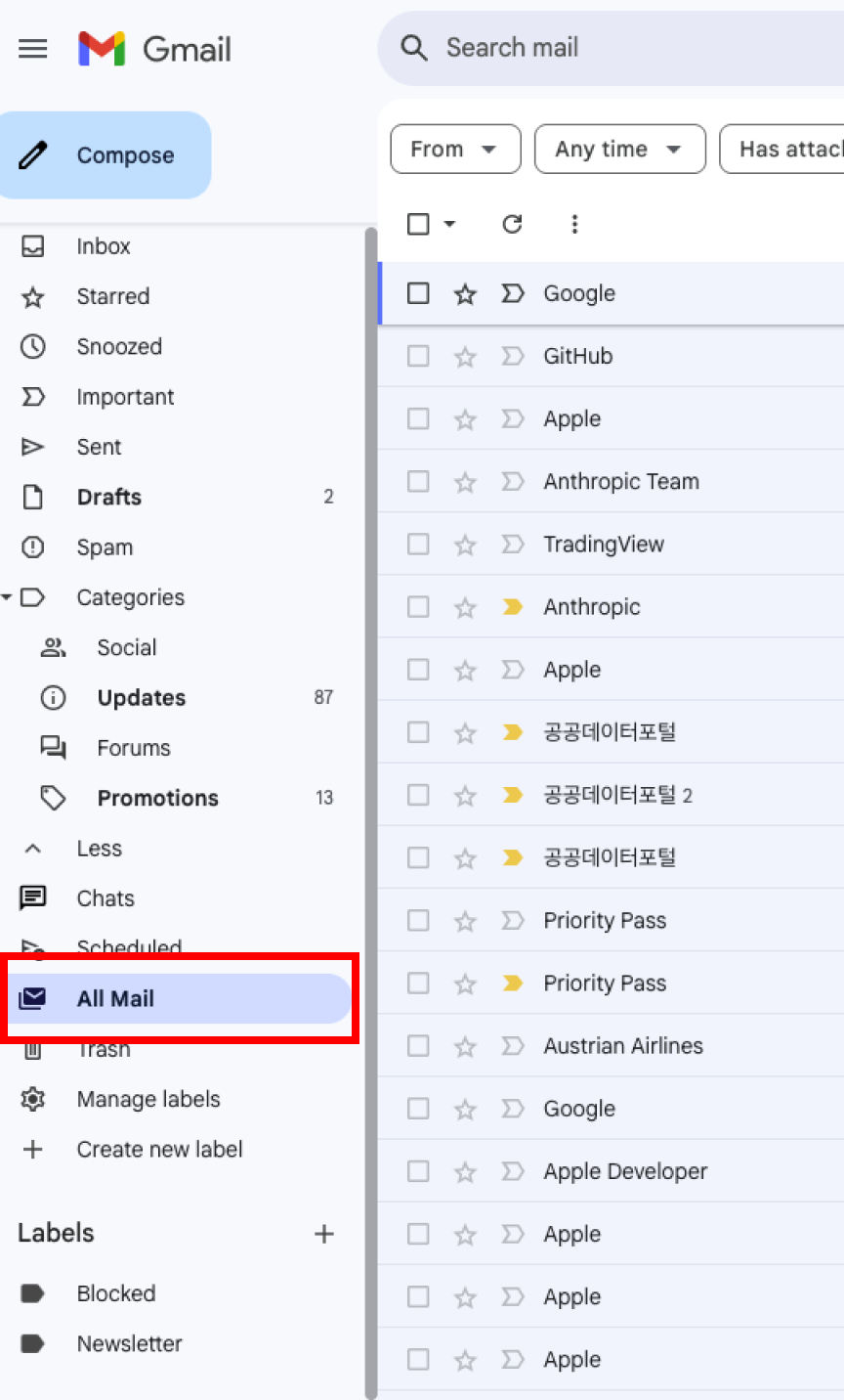 지메일에서 안 읽은 메일을 확인하기 위해서는 좌측 지메일 메뉴에서 '전체메일(All mail)'을 클릭해 주면 됩니다(안 보일 경우에는 '더보기(More)' 버튼을 눌러서 나오게 함). 그러면 별도 분류 없이 전체 이메일을 목록화해서 보여 줍니다. 여기서 '고급 검색(Advanced search)' 버튼을 클릭합니다(때로는 추천 필터로 '안 읽은 메일'을 별도 버튼으로 제공해 주기도 합니다).