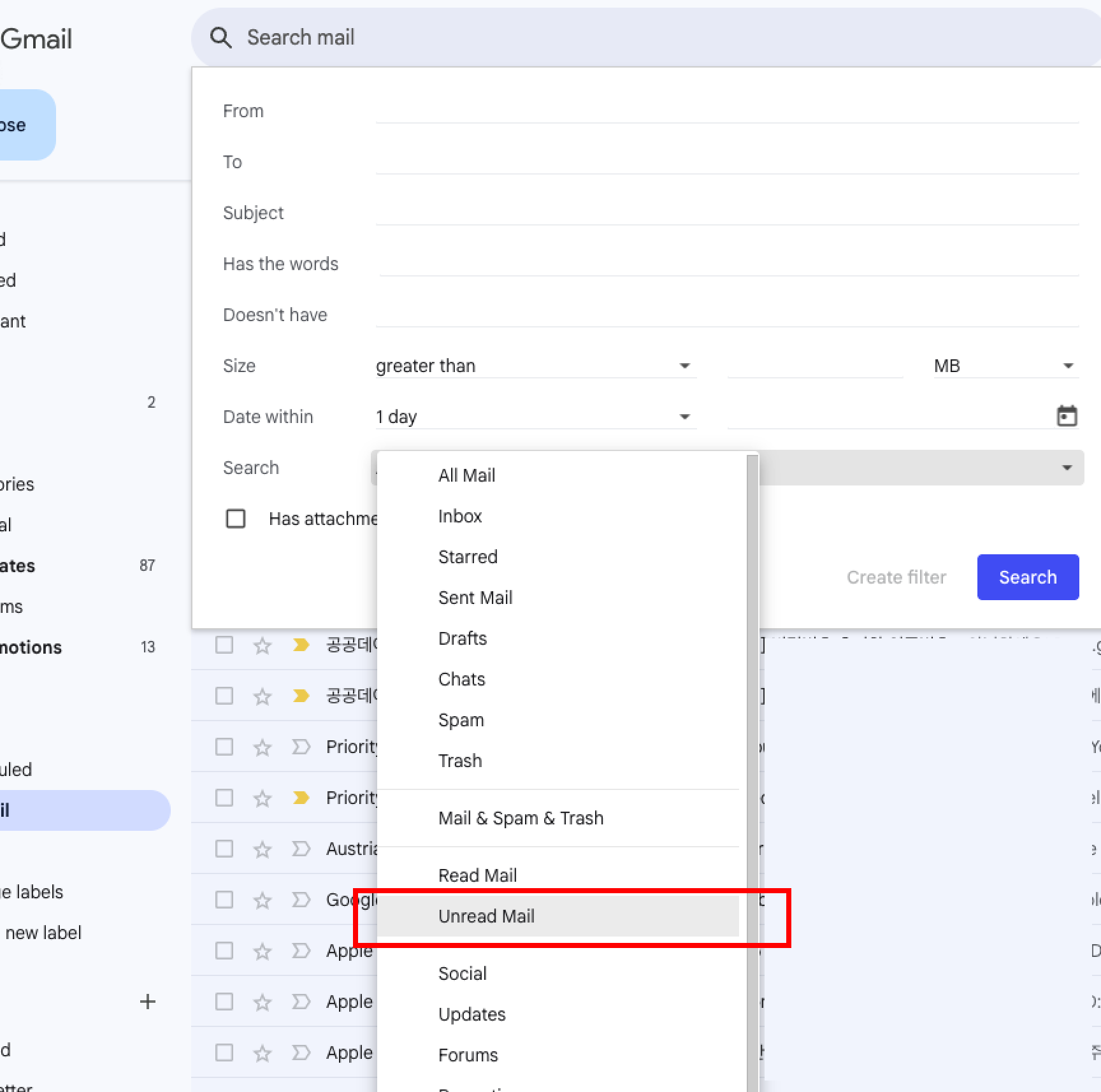 '고급 검색'을 누르면 표시되는 팝업에서 '검색(Search)' 값을 '안 읽은 메일(Unread Mail)'로 설정합니다. 그러면 안 읽은 메일에 대한 목록이 일괄적으로 표시됩니다. 기본으로 약 50개 정도 단위로 끊어서 표시하기 때문에 인덱싱이 안 되는 경우에는 다시 필터를 적용하여 메일들을 다시 불러 와야 할 수도 있습니다. 자세한 내용은 하기 사진 참고 부탁드립니다.
