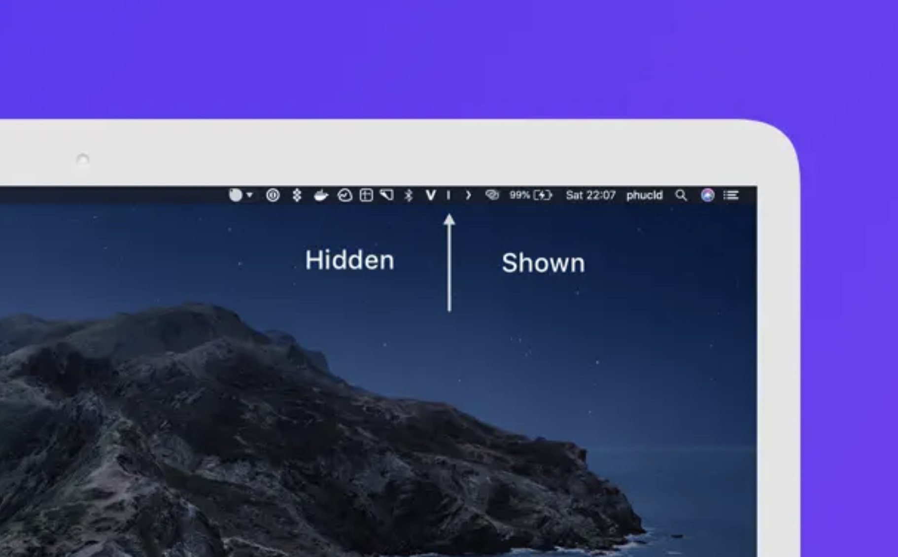 숨기고 싶은 아이콘을 Hidden Bar 구분선의 오른쪽으로 드래그 앤 드롭합니다. 구분선 왼쪽에 있는 아이콘은 계속 표시되며, 오른쪽에 있는 아이콘은 숨겨집니다. - 아이콘 숨기기/표시: