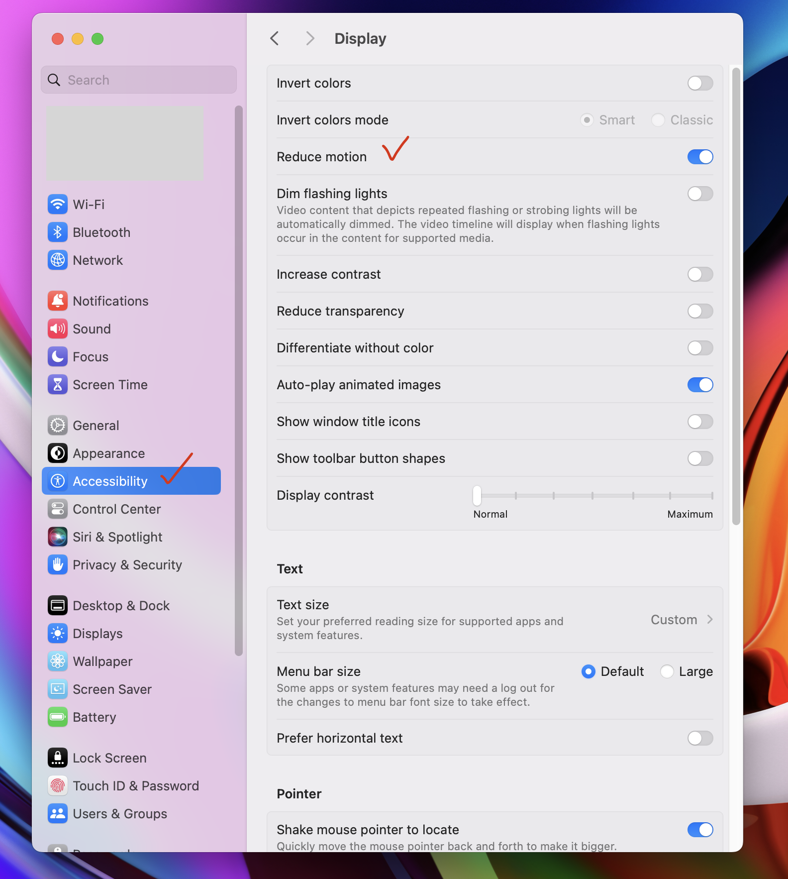 스테이지 매니저 기능은 유용하게 맥의 어플리케이션을 관리하고, 멀티태스킹을 진행할 수 있게 해 줍니다. 다만 애플리케이션 전환 시 애니메이션이 다소 시각적으로 혼잡하게 느껴질 때가 있습니다. 그런 경우 애니메이션을 제거함으로써, 불편을 최소화할 수 있습니다. 설정 방법은 ‘시스템 환경설정 > 접근성 > 디스플레이 > 애니메이션 축소’ 옵션을 설정하면 됩니다. 다만 이 경우 스테이지 매니저 뿐 아니라 맥OS 전체 및 ‘애니메이션 최소화’ 접근성 환경을 지원하는 어플리케이션 전부에 적용되므로 유의가 필요합니다. 스테이지 매니저의 애니메이션만 제거하는 방법은 2023년 11월 기준으로 없습니다.