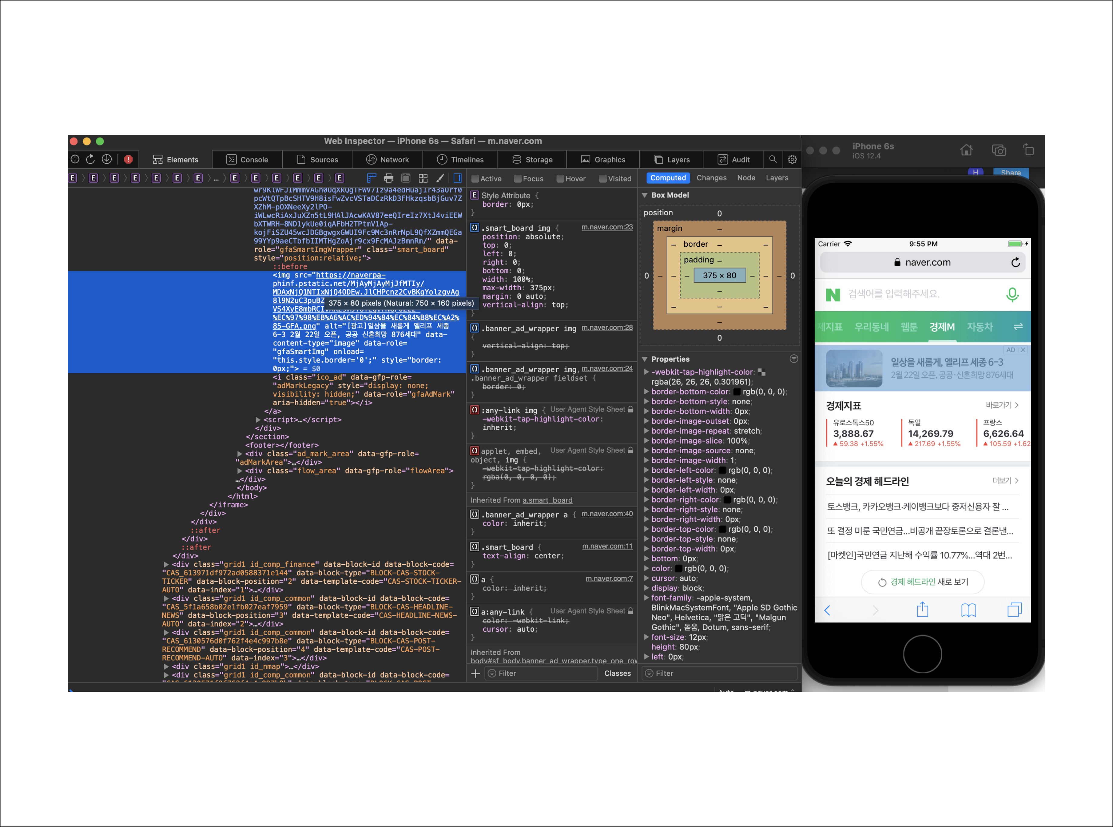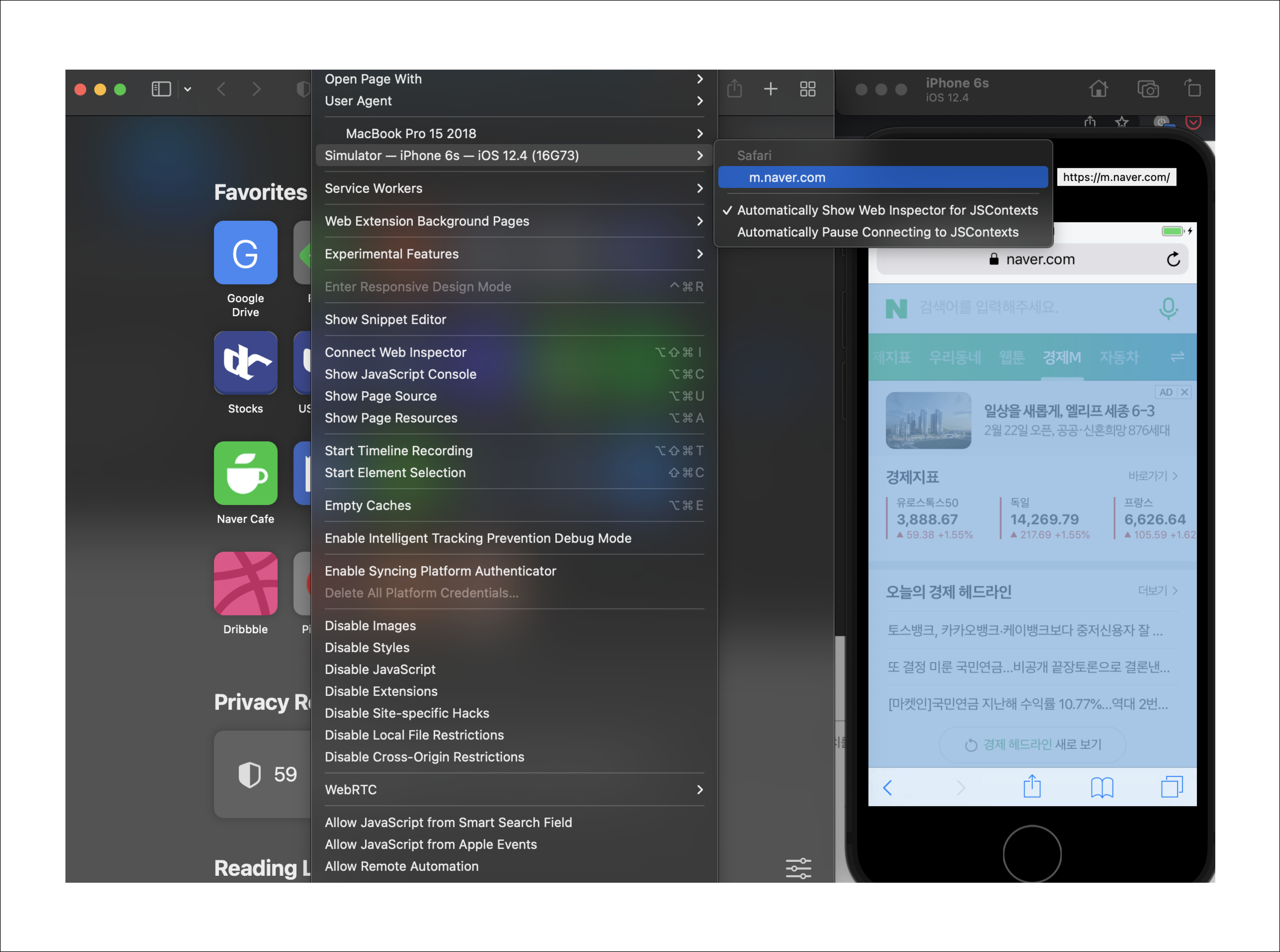 아래 이미지와 같이 가상머신의 모바일 사파리에서 실행하는 웹사이트들이 Mac 컴퓨터용 사파리의 개발자도구에서 확인이 가능해진 것을 볼 수 있습니다. 이 방법을 통해서 보다 즉각적인 버그 사항 또는 개발내용 확인이 가능해지며, 여러 버전과 기기에서의 구동환경도 테스트할 수 있습니다.