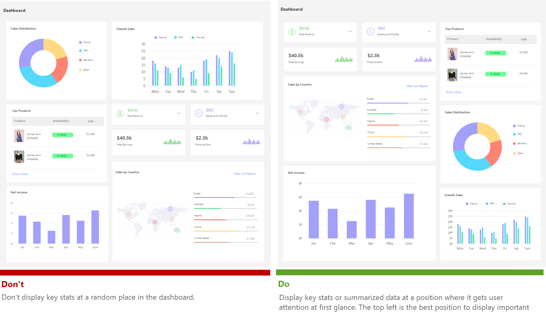- 대시보드를 읽기 쉽게 하기 위해서, 비슷한 시각화 기술과 레이아웃을 사용하는 것이 좋습니다.