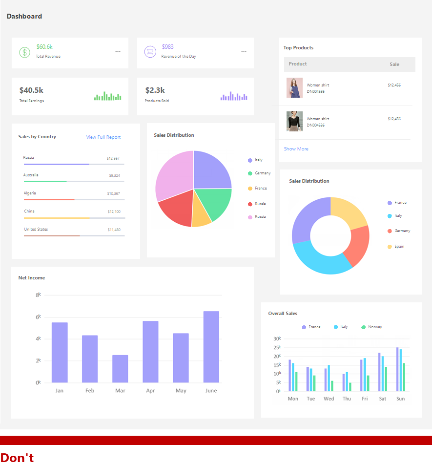 복잡한 대시보드는 복잡한 정보를 단순하게 표현해야 하는 대시보드의 목적성에 부합하지 않는다고 볼 수 있습니다. 단순하지 않다면 대시보드 상에 무엇인가 문제가 있는 것입니다.