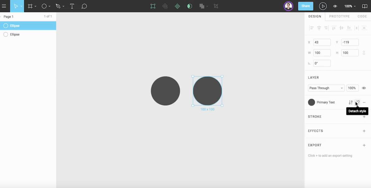 링크가 끊어진 모양의 아이콘은 Detach Style 기능으로 기존 정의된 스타일 값에 값이 종속되는 것을 끊는 역할을 합니다. 스타일의 생성 및 관리는 Fill Color 외에도 Stroke 와 Text, Effects 등등 다양한 속성에 적용할 수 있습니다.