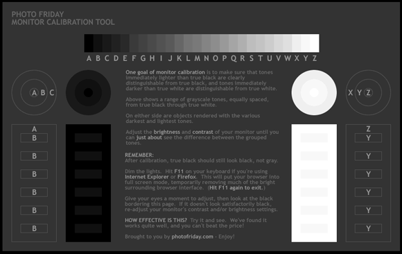 포토프라이데이의 모니터 캘리브레이션 툴은 밝기와 대비를 조절하는 데에 도움을 주는 웹페이지로 구성되어 있습니다. F11 키를 눌러 웹브라우저를 풀스크린 모드로 활성화시킨 후 조절하는 것이 권장된다고 합니다.