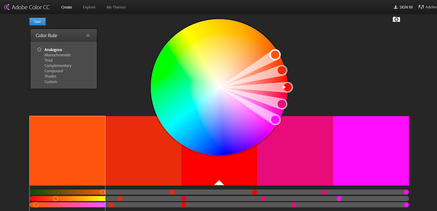 - 매우 유명한 서비스로 이미 아시는 분들이 있을 수도 있습니다. 5가지 색을 구성된 컬러조합을 만들 수 있는 웹사이트입니다. 쉽게 유사색, 보색 등을 셀렉팅할 수 있으며, 직관적인 UI를 특징으로 합니다.