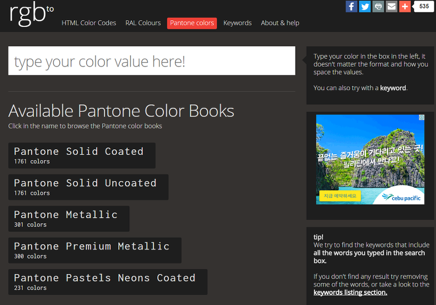 - rgbto 사이트는 팬톤 색상 뿐 아니라 웹디자인에 사용되는 색상 전반에 대한 정보를 제공합니다. keyword로 셀렉팅이 가능한 html color codes 부터 RAL, 팬톤 컬러 차트를 함께 제공합니다. 웹디자인에 바로 응용이 가능하도록 헥사코드를 제공하니, 필요하신 분들은 이용해 보시기 바랍니다.