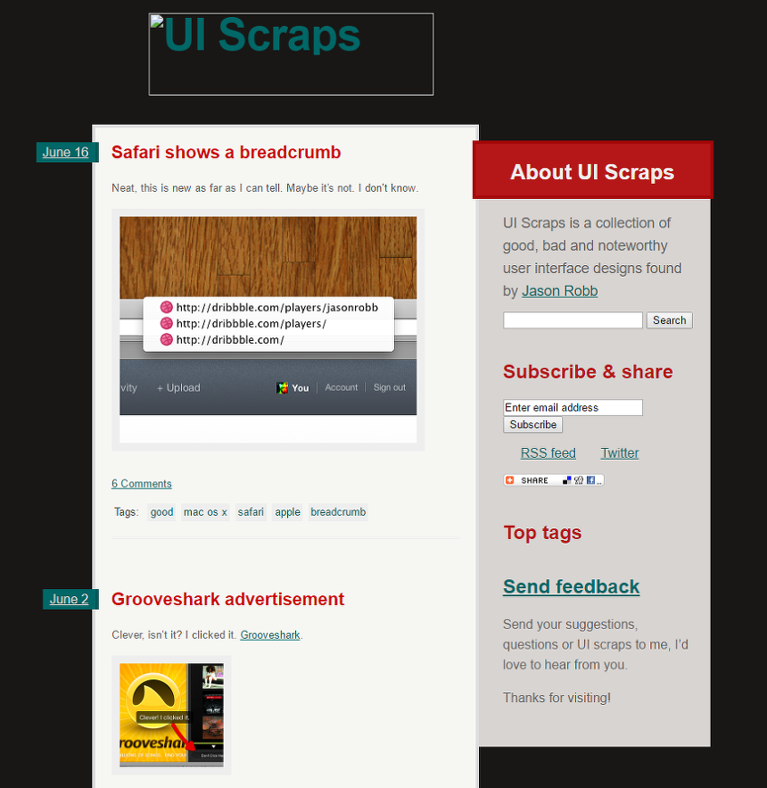 텀블러 블로그인 UI Scraps입니다. 좋은 UI디자인 사례와 나쁜 UI디자인 사례를 함께 소개합니다. 비평과 함께 제공되기에 어떤 디자인이 북저러하게 평가되는 지에 대한 정보를 얻을 수도 있습니다.