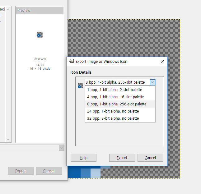 위와 같이 bit 수를 설정하여 ico 파일 exporting이 가능합니다.
