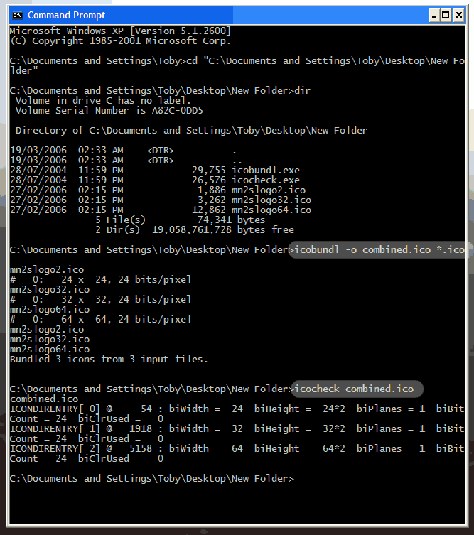 *icocheck의 경우 ico파일이 몇 개의 파일로 구성되어 있는지 몇 비트컬러인지 확인할 때 사용 6. 합쳐졌다는 내용을 확인하고, 합쳐진 파일 또한 확인합니다.