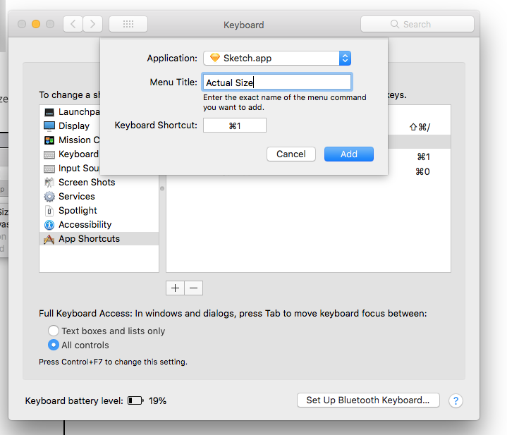 다음으로 스케치를 실행해서, 단축키를 맵핑하고 싶은 커맨드 이름을 확인합니다. 저는 지금 Fit to 100% 단축키인 Actual Size라는 커맨드의 단축키를 변경하고자 합니다.