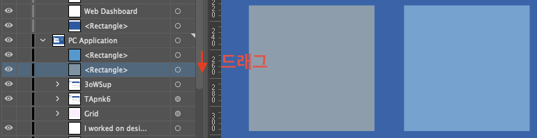 이를 위해서는 레이어 패널에서 서브레이어로 존재하는 개체들을 확인할 필요가 있습니다. 이 상태에서 아래 그림과 같이 해당 레이어를 선택하는 버튼인 우측의 ‘동그라미’ 버튼을 알트를 누른 상태에서 드래그하여 스타일을 복사/붙여넣기 하고자 하는 개체에 끌어 놓으면 됩니다.