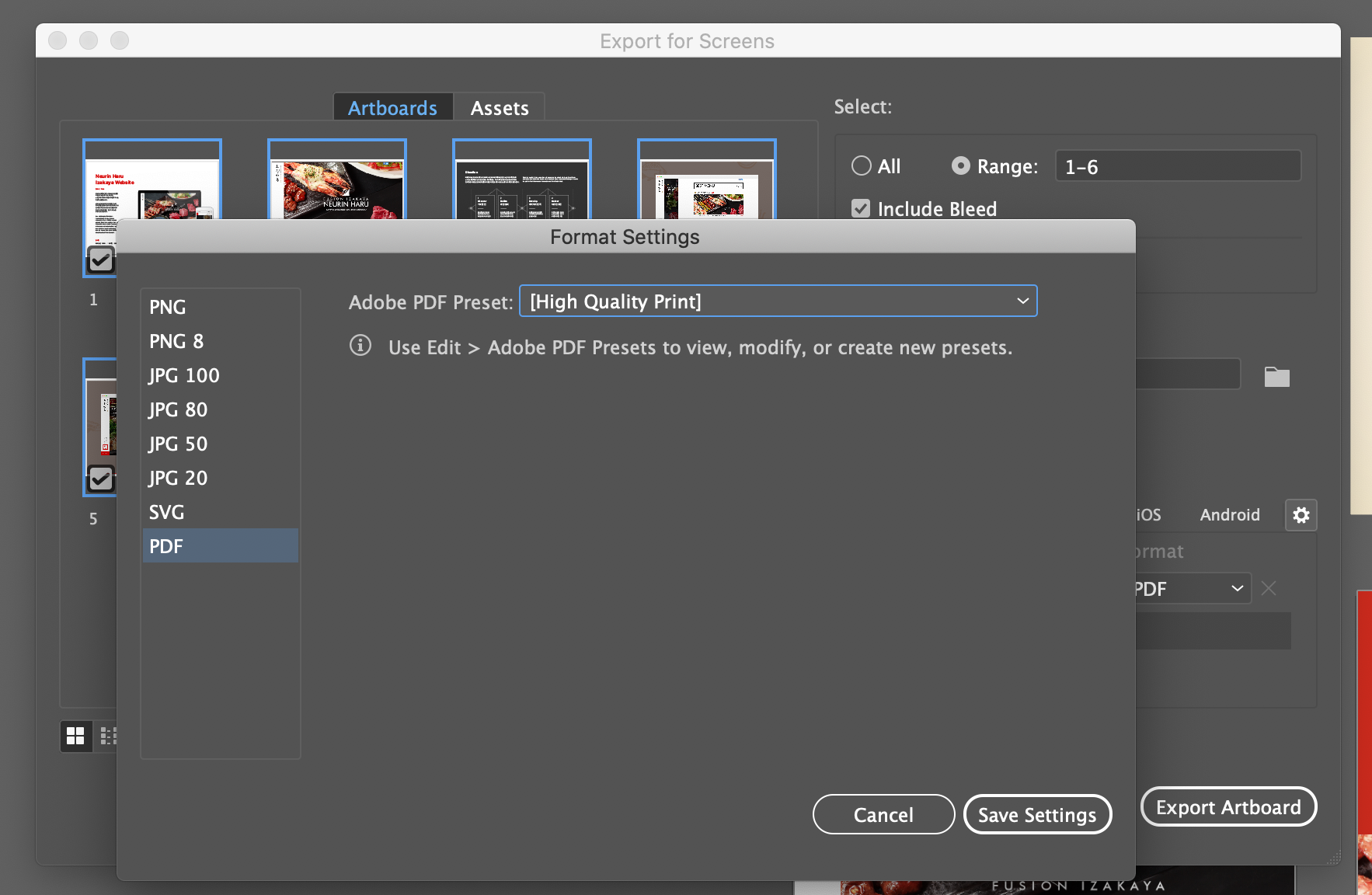 일러스트레이터를 통해 PDF산출물을 만드는 경우는 매우 많습니다. Save as를 통해서 AI 파일 자체를 PDF로 저장하는 것도 방법이고, 실제로 ‘인쇄’ 작업 등에 있어서는 이 방법이 더 효율적일 수 있습니다. 다만 일부 아트보드들만 선택해서 저장하고 싶은 경우, 그리고 별도의 파일 생성 없이 PDF 익스포팅을 원하는 경우에는 ‘File > Export > Export for Screens’ 메뉴에서 파일 포맷을 PDF로 선택한 후 익스포팅을 진행하면 됩니다. 화면에서 볼 수 있듯이 전체 아트보드 또는 일부 아트보드만 선택하여 익스포팅을 선택할 수 있습니다. 다만 기본 셋팅값이 저화질로 설정이 되어 있기 때문에 관련 버튼 옆에 있는 설정 버튼을 눌러서 품질을 고화질로 선택한 후 진행하면 고품질의 PDF 파일들을 얻을 수 있습니다.